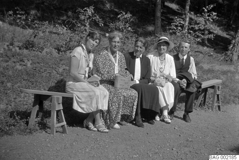 Kuvert från Jörje Fotografiska AB: Man och fyra kvinnor på en improviserad bänk, ext. ?.