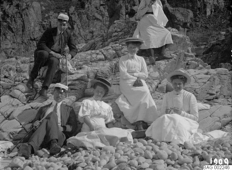 Vid klippor: Einar, Hardy, Ellen, killar Bökman, Maria. 1909.