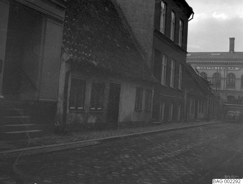 Gatubild - Jöns Filsgatan - minihuset, Västra skolan. 1930.