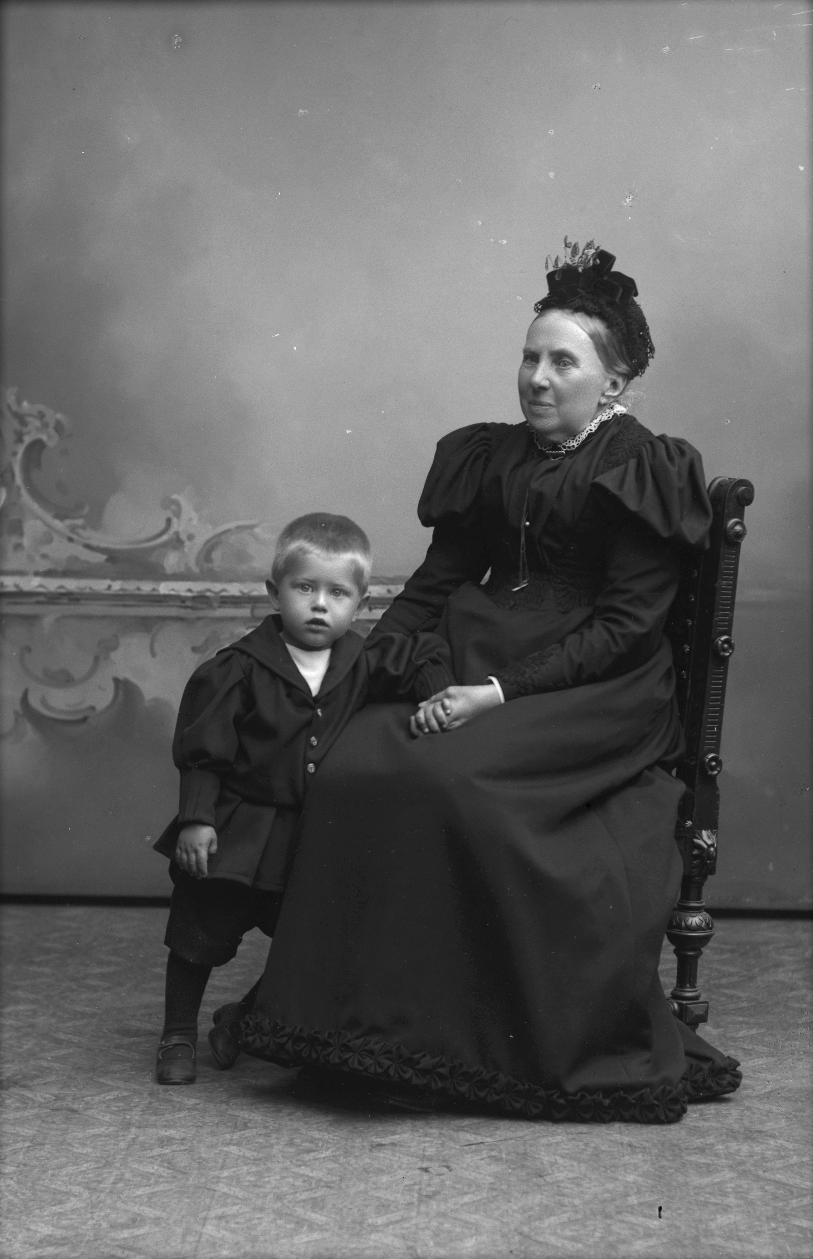 - Porträtt i helfigur av Amelie Nordström i Veberöd med okänd pojke, möjligen barnbarn. Kvinnan sittande på stol, fondvägg utgör bakgrunden.