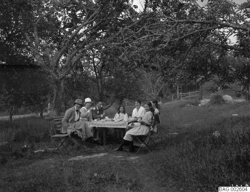 Smålands Taberg: Sällskap vid bord i trädgården - Ahlbergs och Bagers hos Stafves vid Westersjön. 1919.