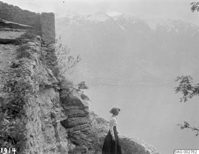Italien: Tremosine - kvinna på klippa över havet. 1914.