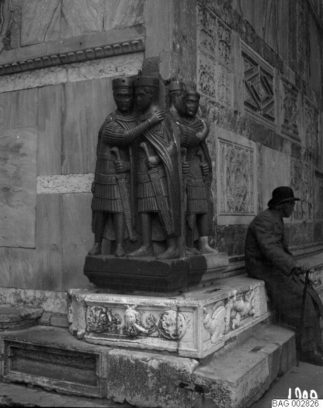 Venedig: Gatubild - byggnadshörn med skulpturer, man sittande. Porfyrstaty av de fyra tetrarkerna vid Markuskyrkan. 1909.