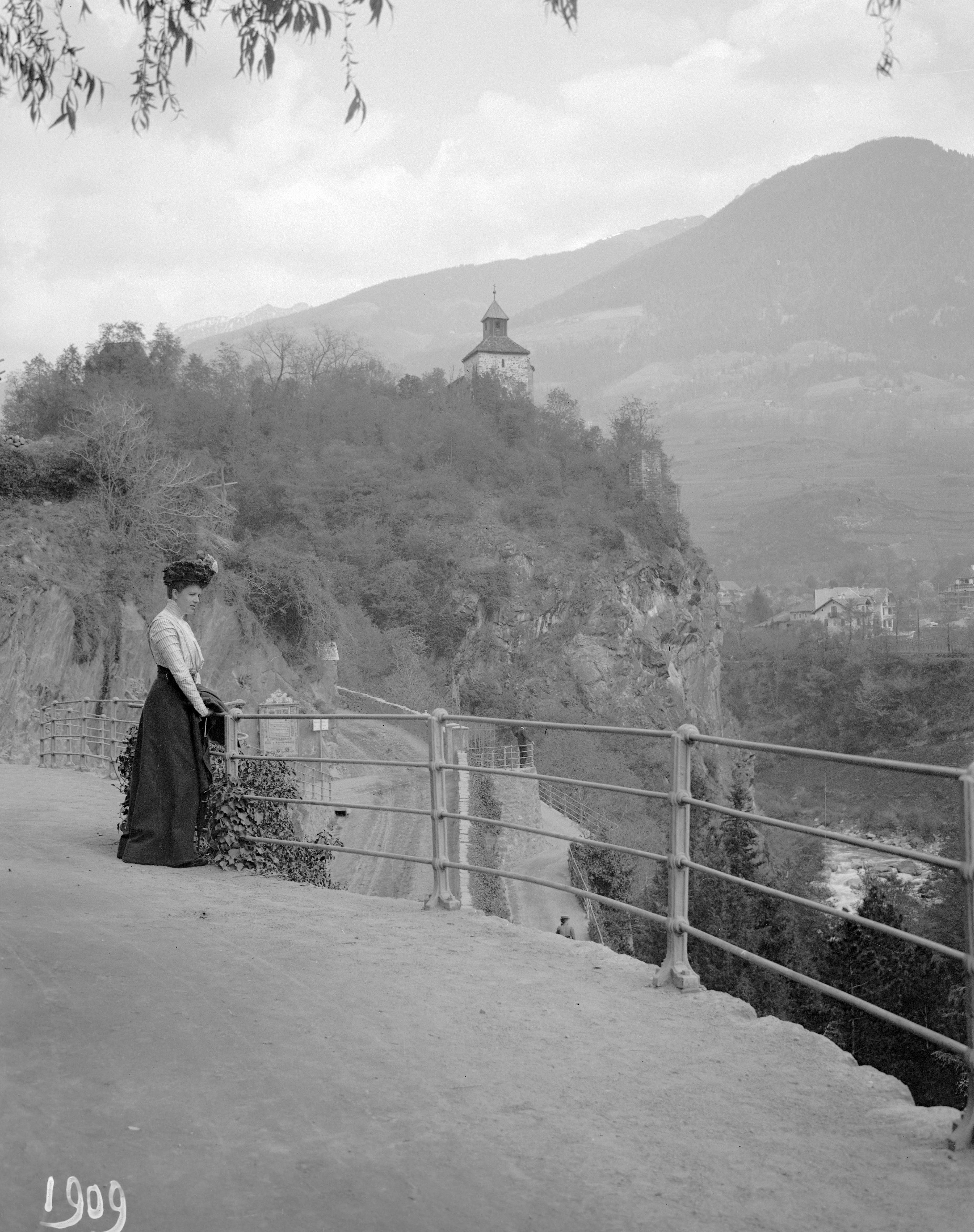 Merano: Kvinna på utsiktsplatsen - landskap med landsväg, kyrka och berg i bakgrunden. 1909.