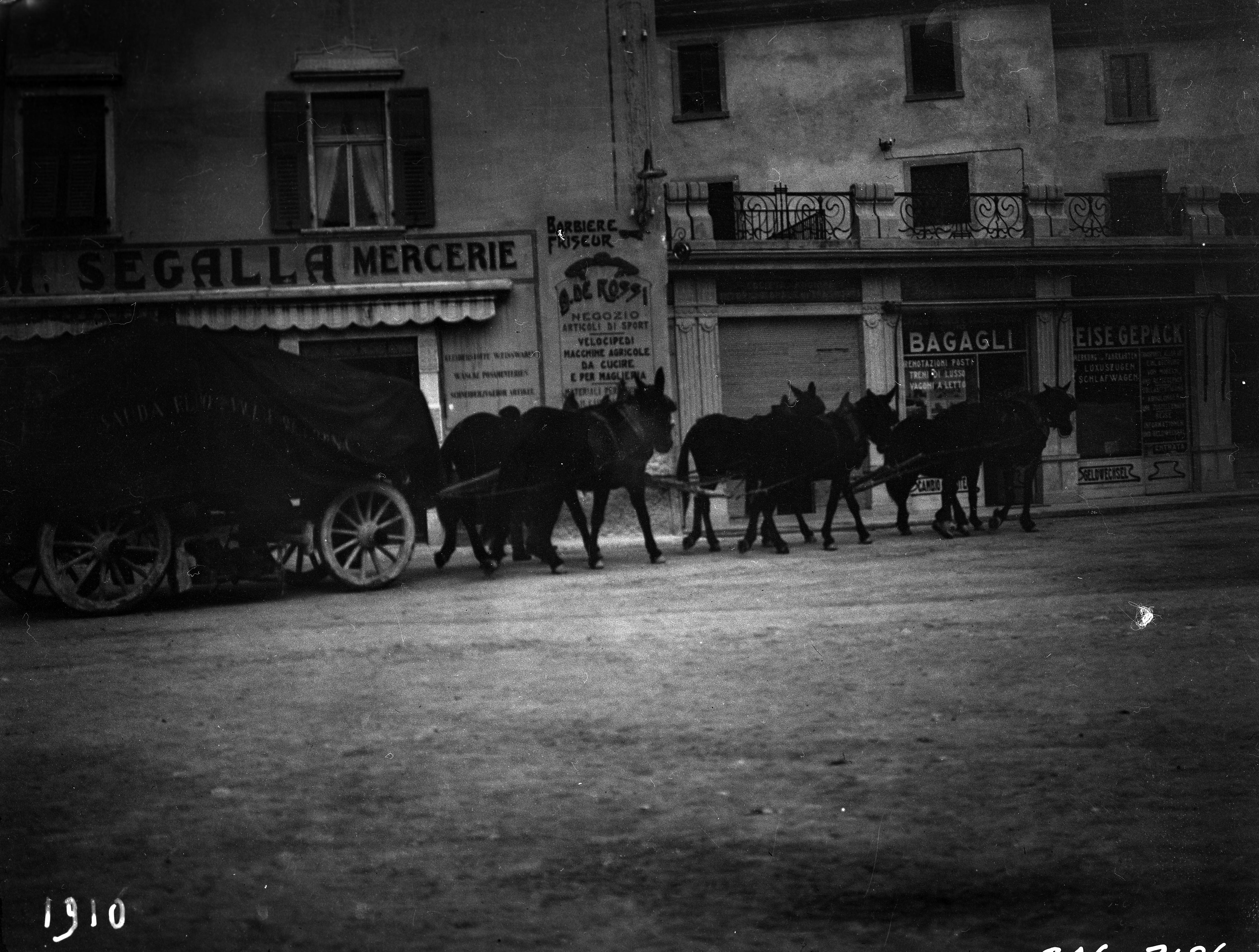 Italien, Trento, Riva del Garda, Garda, Gardasjön, gatubild, gata, affärer, barberare, skyltar, skyltfönster, åsna, åsnor, åsnevagn, vagn, vagnar, dragdjur
