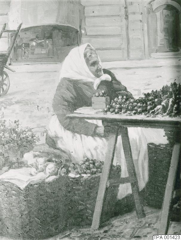 Repro. Oljemålning av Leon Fagercrantz (detalj) - torghandel, fruktförsäljerska. Bilden tagen 1957.
