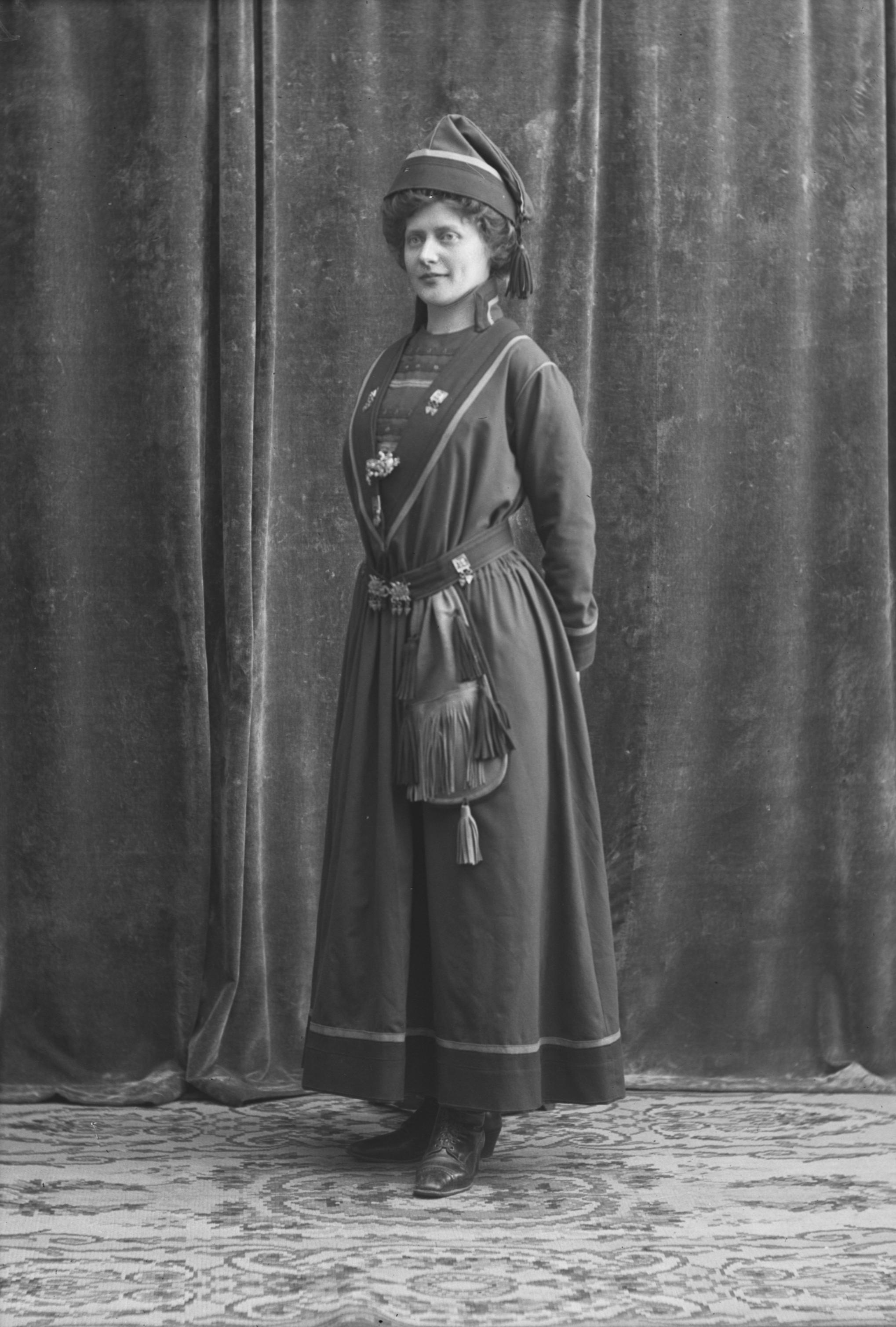 Porträtt i helfigur av fröken Lundgren vid Clarbergs Konditori, iklädd fokdräkt.