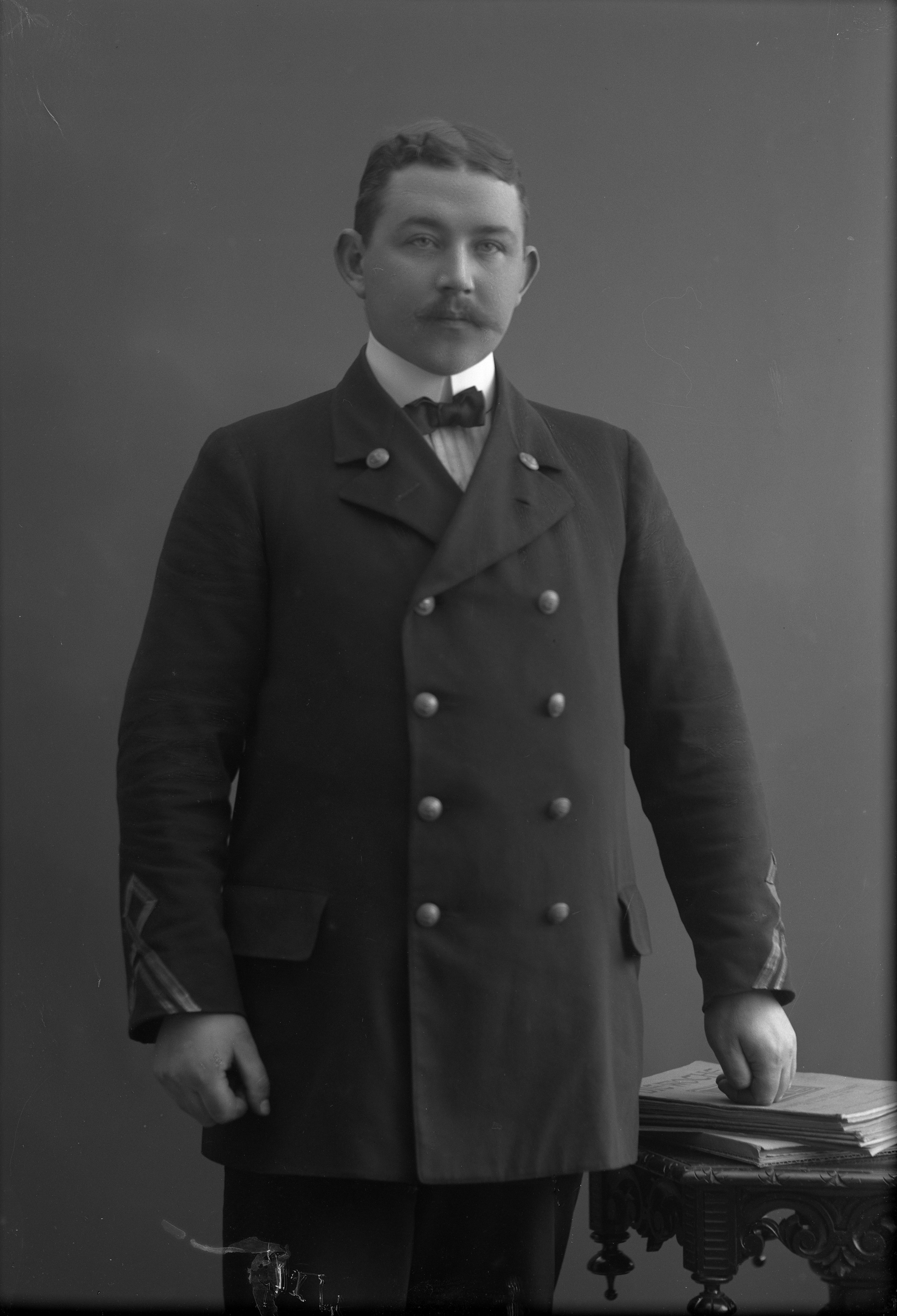 Porträtt i helfigur av herr Magnusson, iklädd yrkesuniform, möjligen stadsbud, stående vid litet bord. På bordet ligger några böcker.