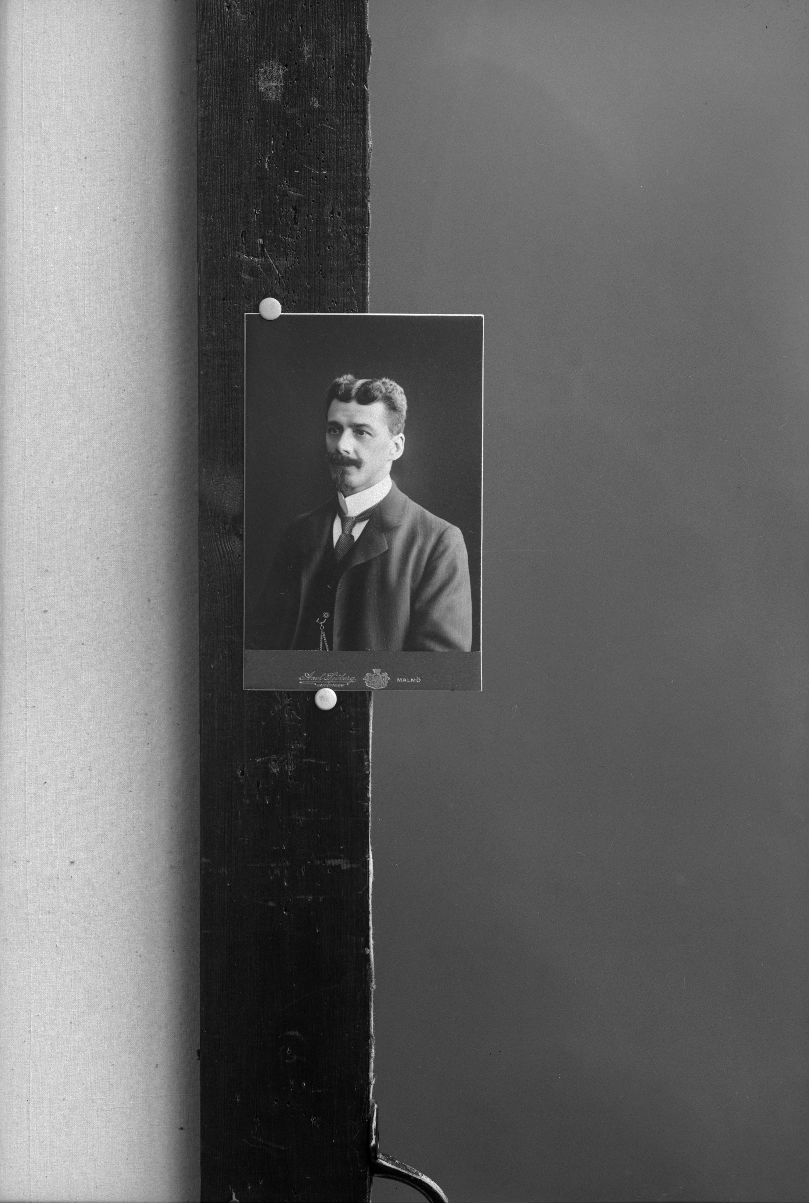 Porträtt i halvfigur av oidentifierad man. Visitkort med ateljélogotyp, "Axel Sjöberg /Malmö".