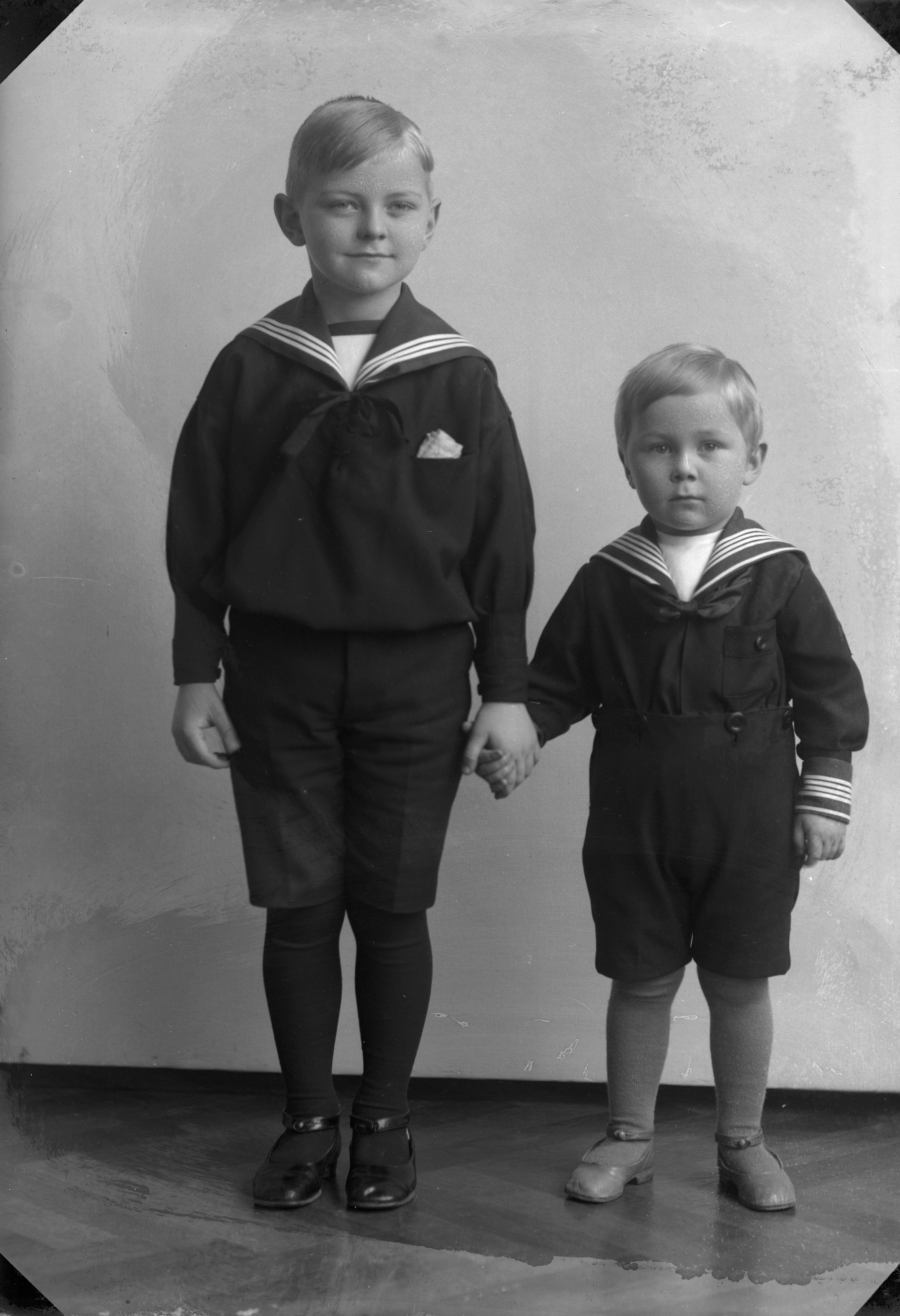 Porträtt i helfigur av Henry Anderssons söner, iklädda sjömanskostym, hållande hand.
