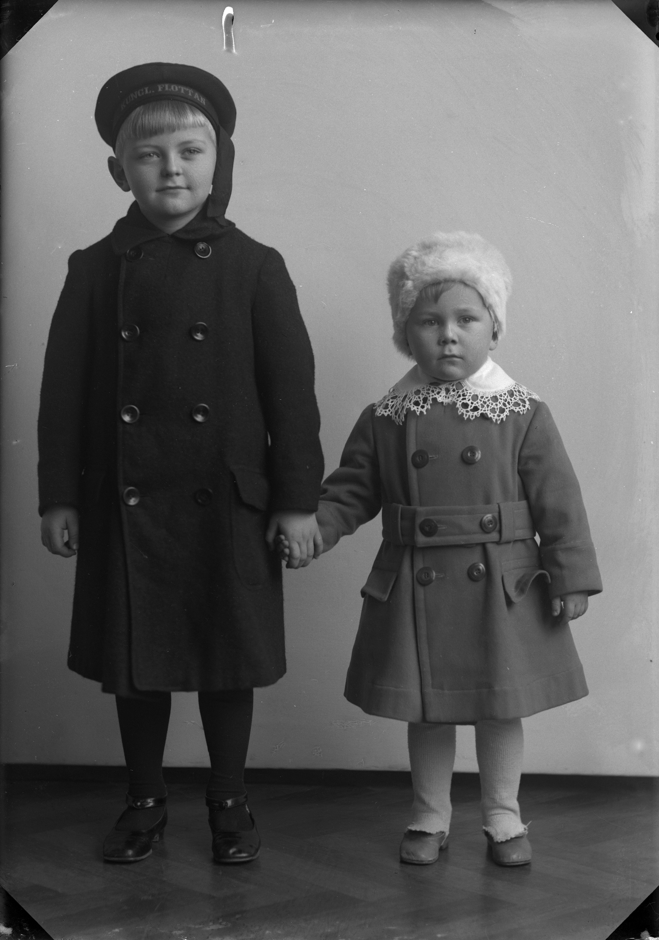 Porträtt i helfigur av Henry Anderssons söner, iklädda ytterkläder och mössor, hållande hand.