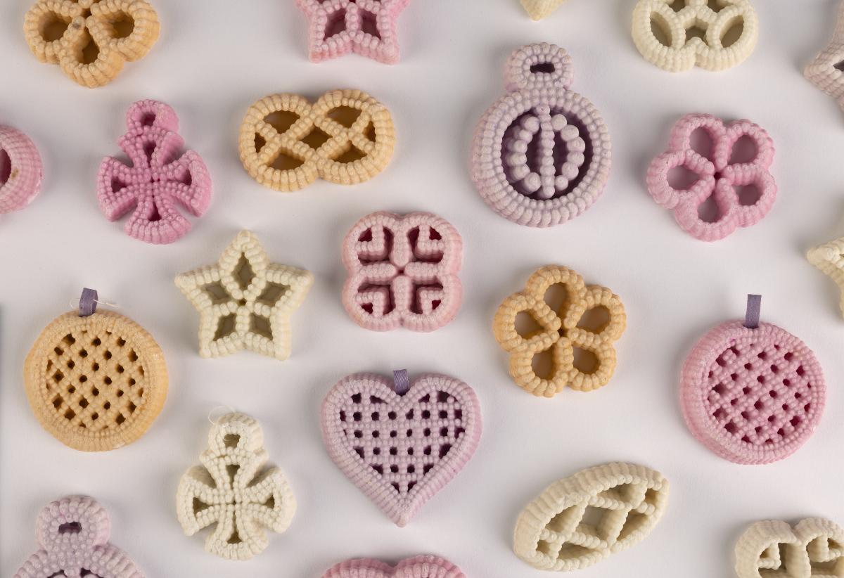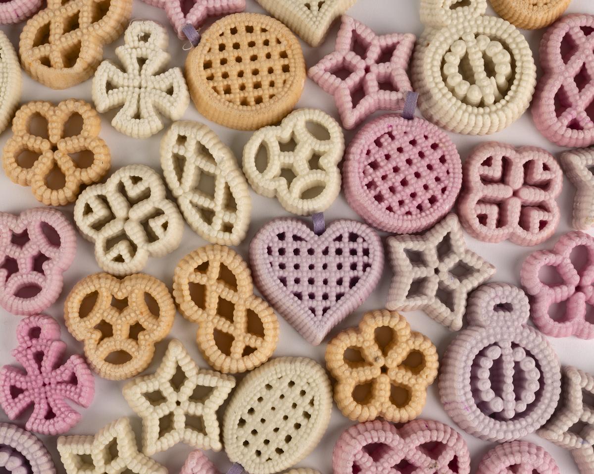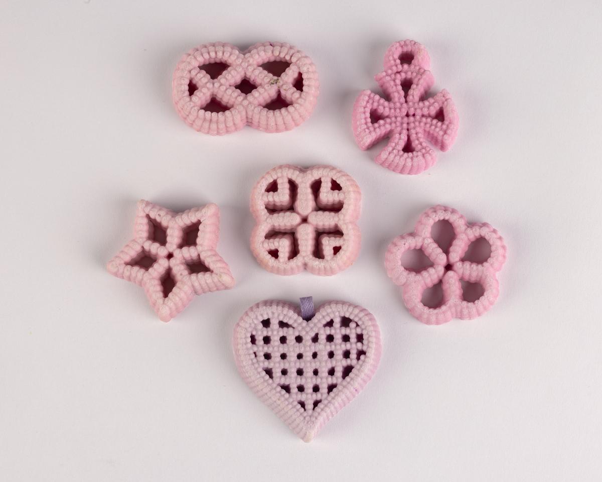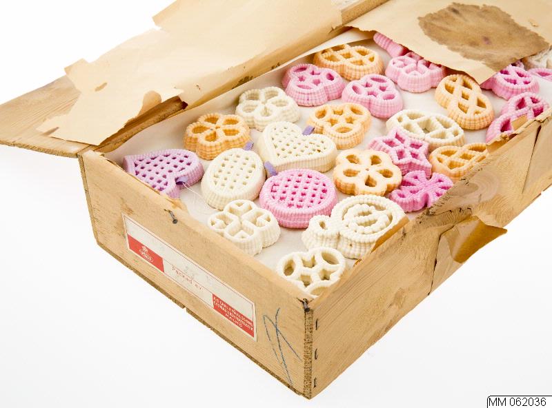 Julgransprydnader i olika färger och former tillverkade av socker. Ligger i en trälåda märkt AB Carl P Påhlssons Choklad- och konfektfabrik Malmö.