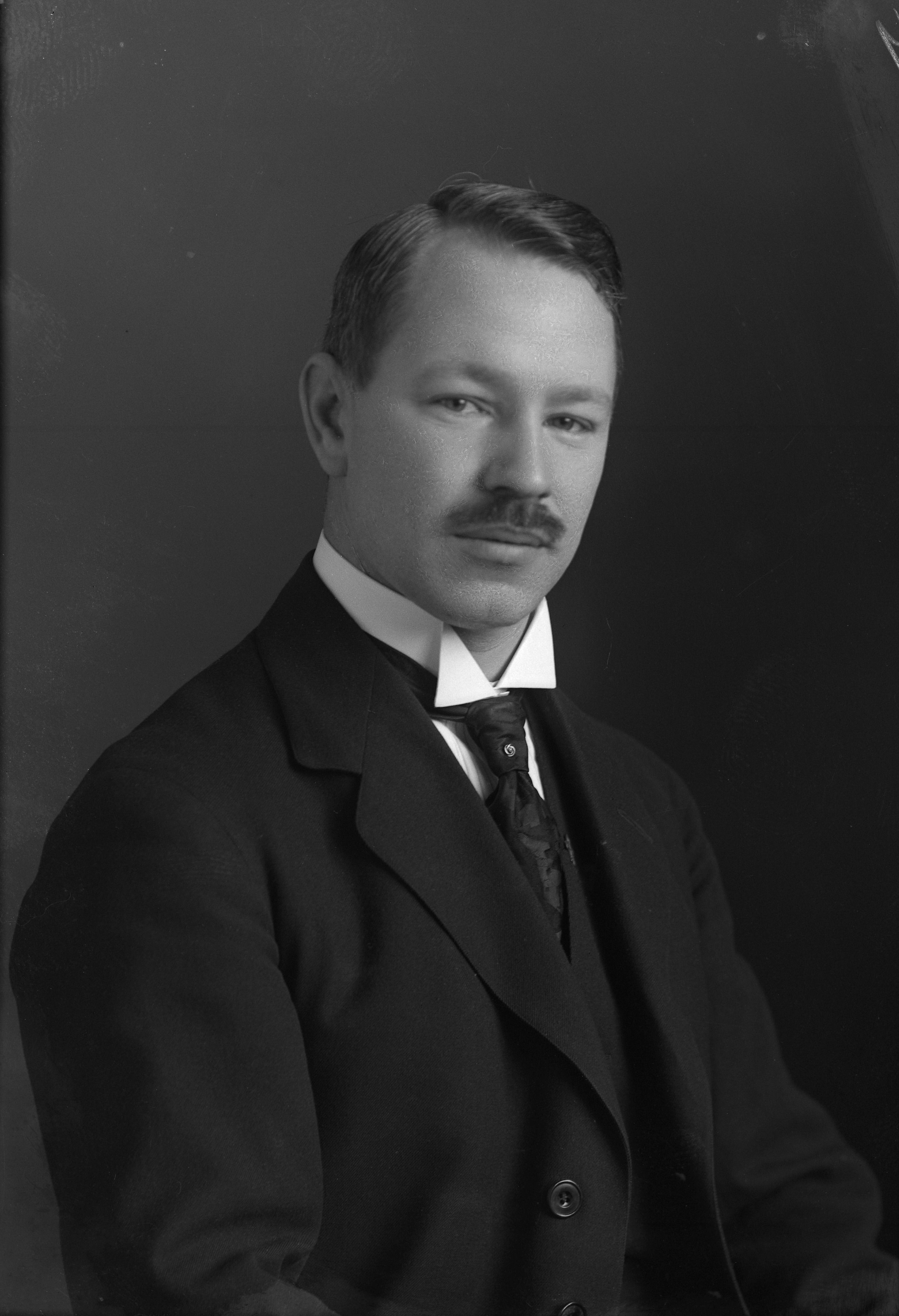 Porträtt i halvfigur av järnvägskontorist Gustaf Orwars Persson.