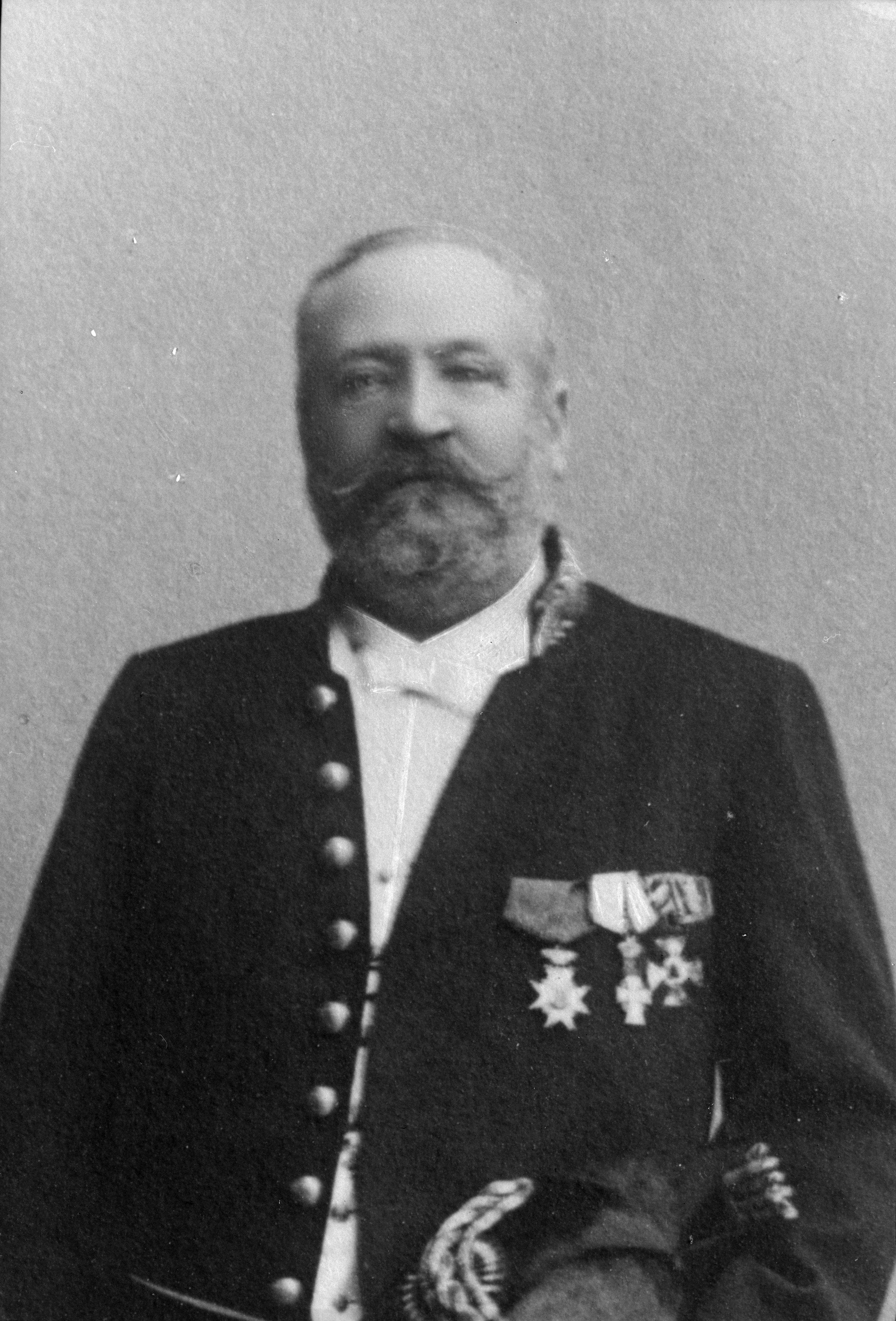 Porträtt i halvfigur av tullinspektor Jöns Boman Persson med medaljer på bröstet.