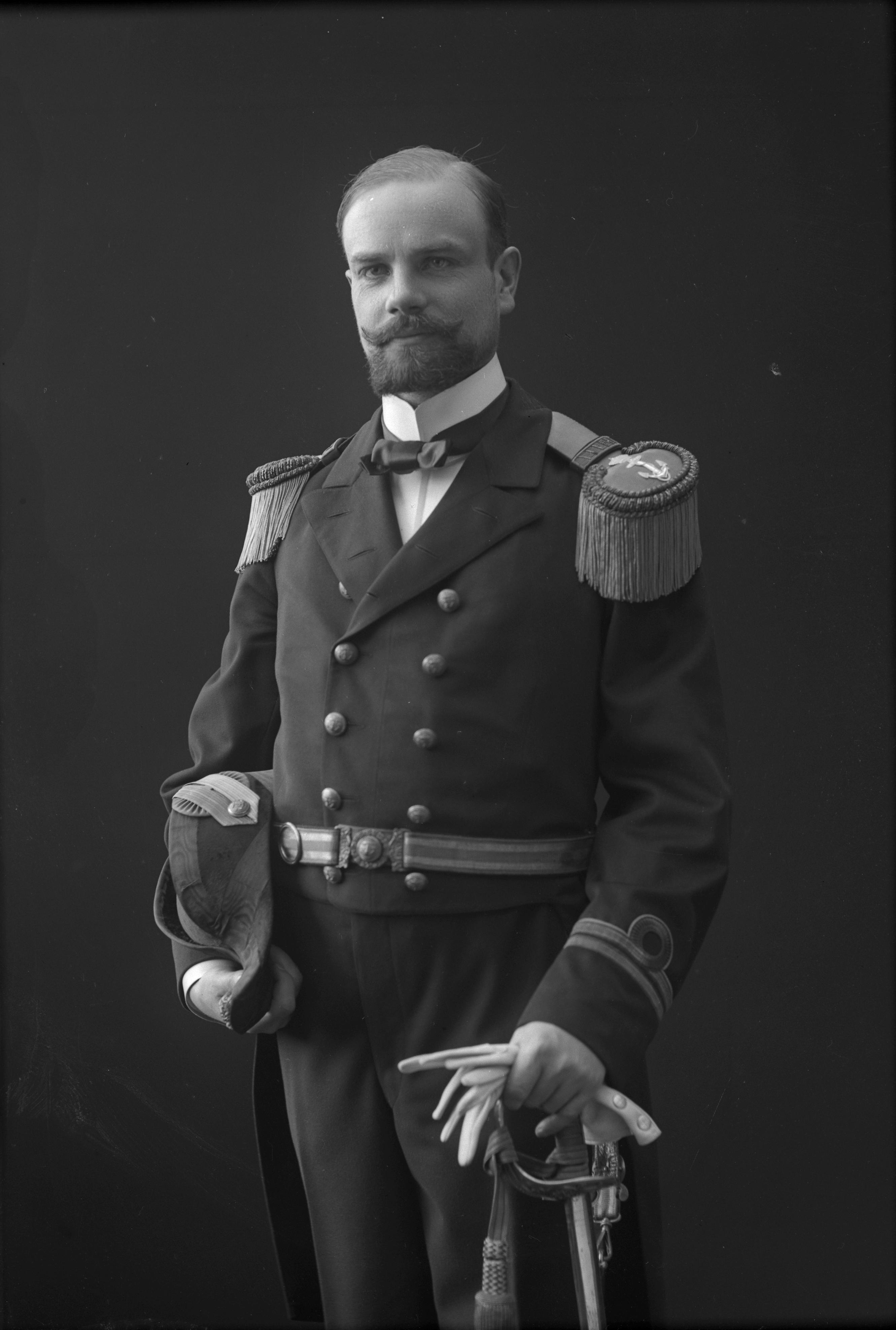 Porträtt i helfigur av löjtnant Wöhler, iklädd militäruniform, hållande hjälm, handskar och sabel.