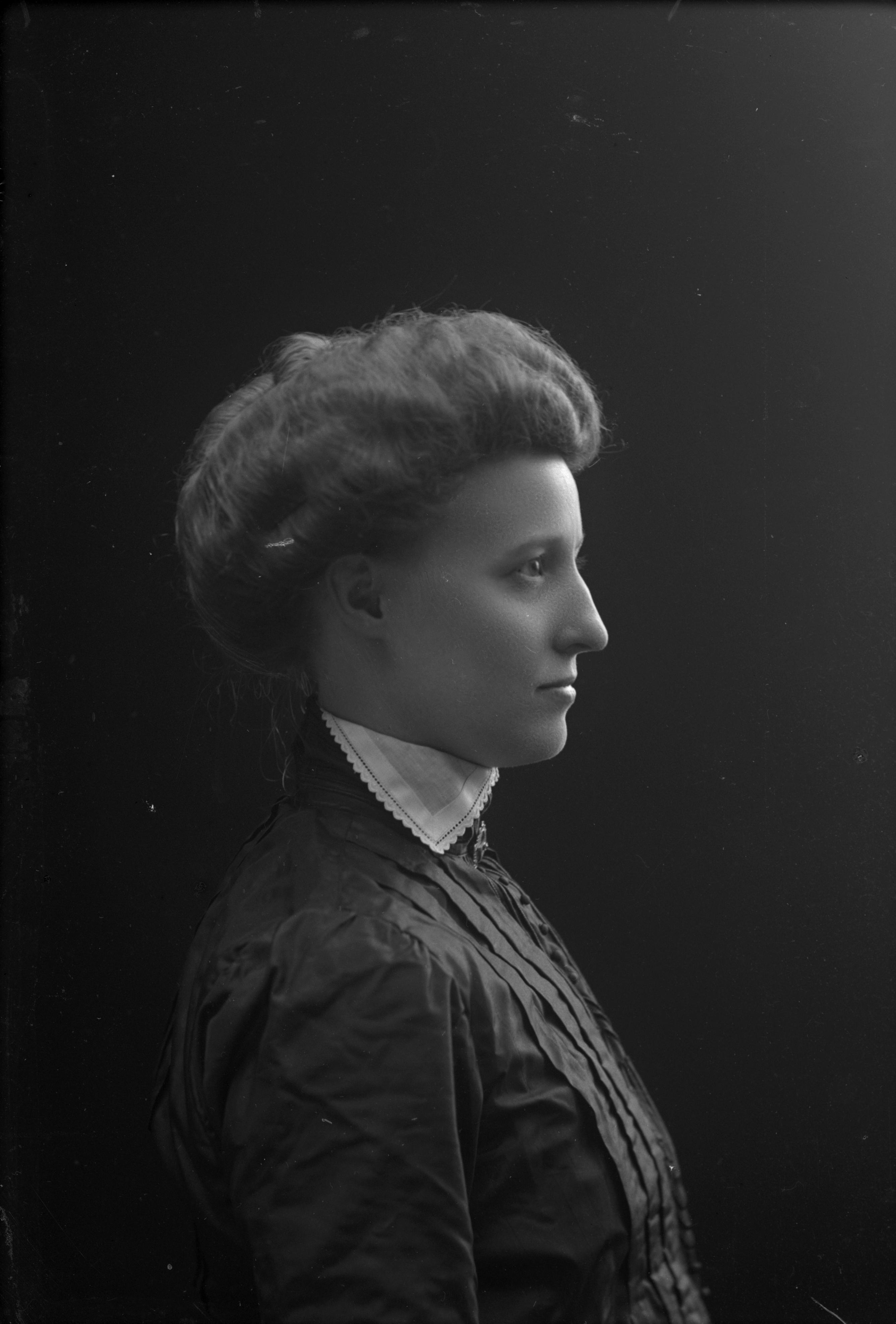 Porträtt i halvfigur, profil, av hotellpigan Sally Jönsson.