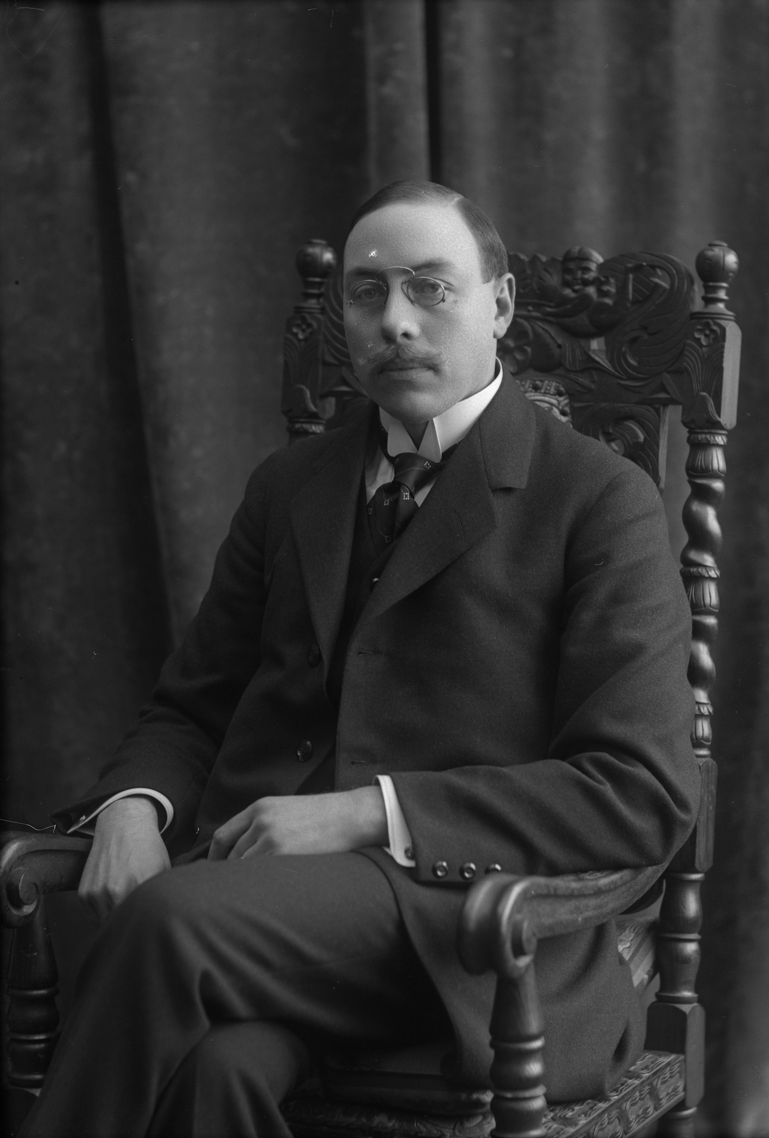 Porträtt i helfigur av kontorschef Torsten Haglund, sittande i karmstol.