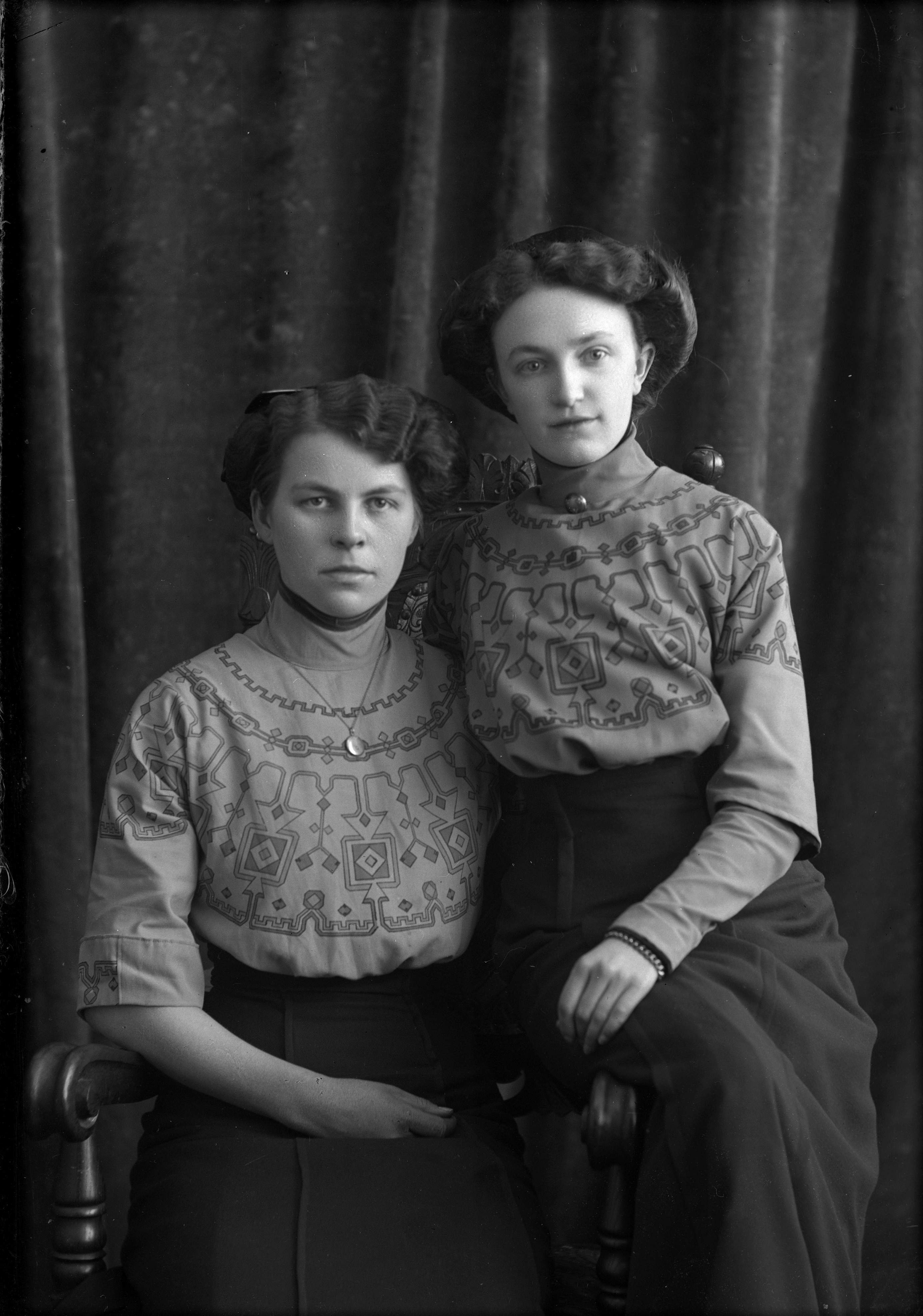 Porträtt i helfigur av butiksbiträdena Ester Ljung och Märtha Nilsson. Ester sittande på stol, Märtha på dess armstöd.