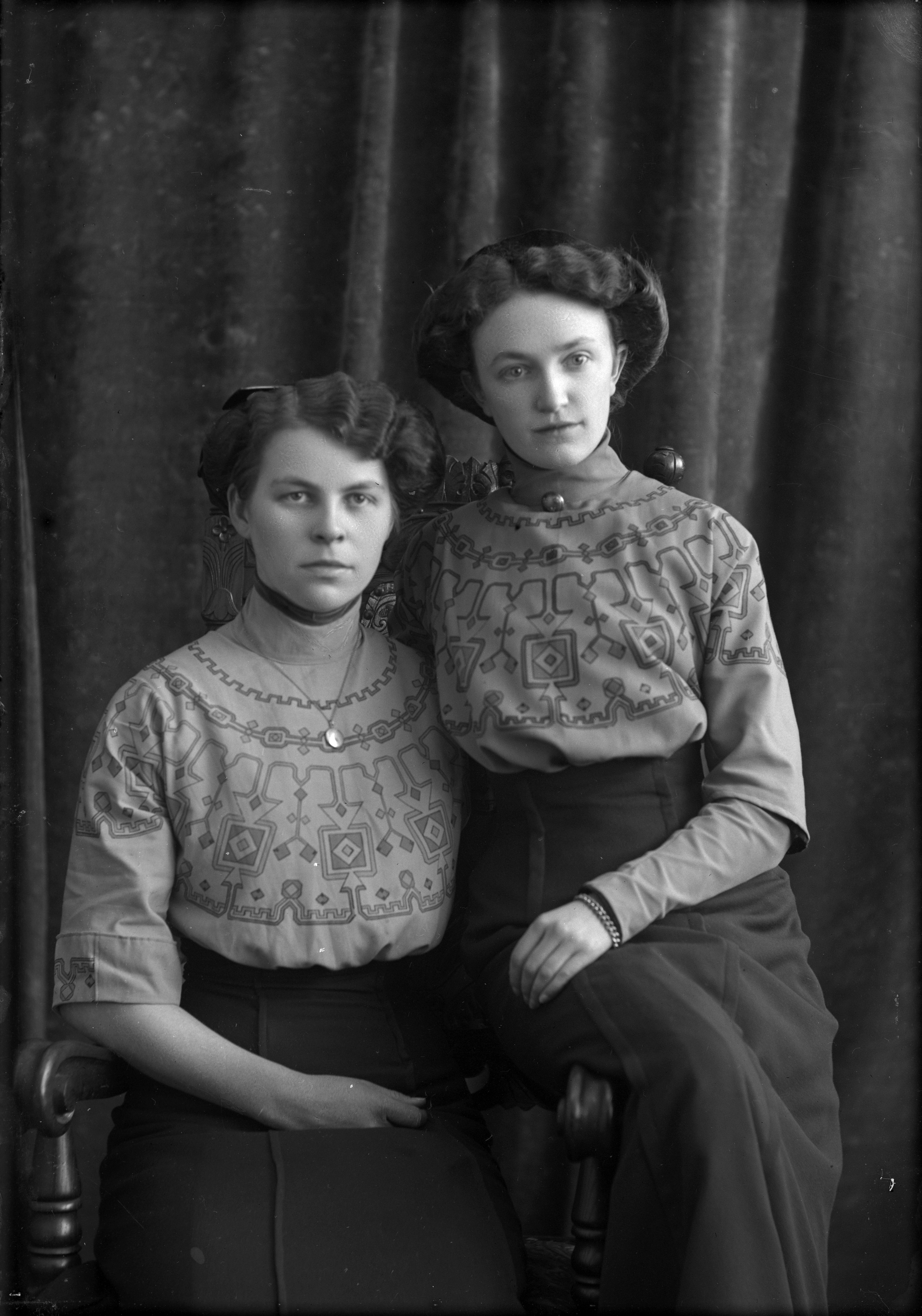 Porträtt i helfigur av butiksbiträdena Ester Ljung och Märtha Nilsson. Ester sittande på stol, Märtha på dess armstöd.