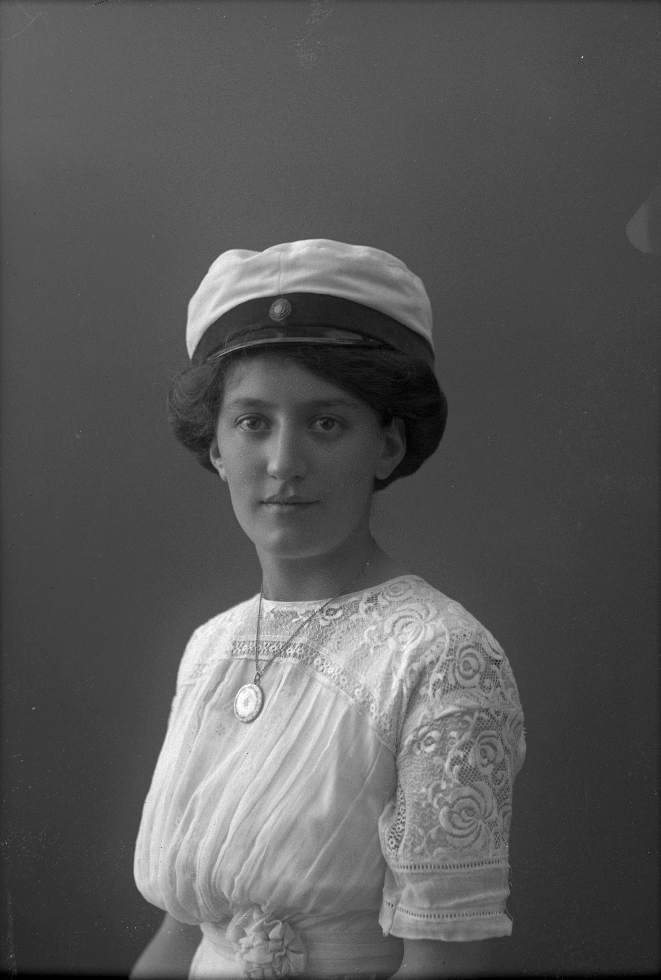 Porträtt i halvfigur av Elna Löfström, klädd i studentmössa.
