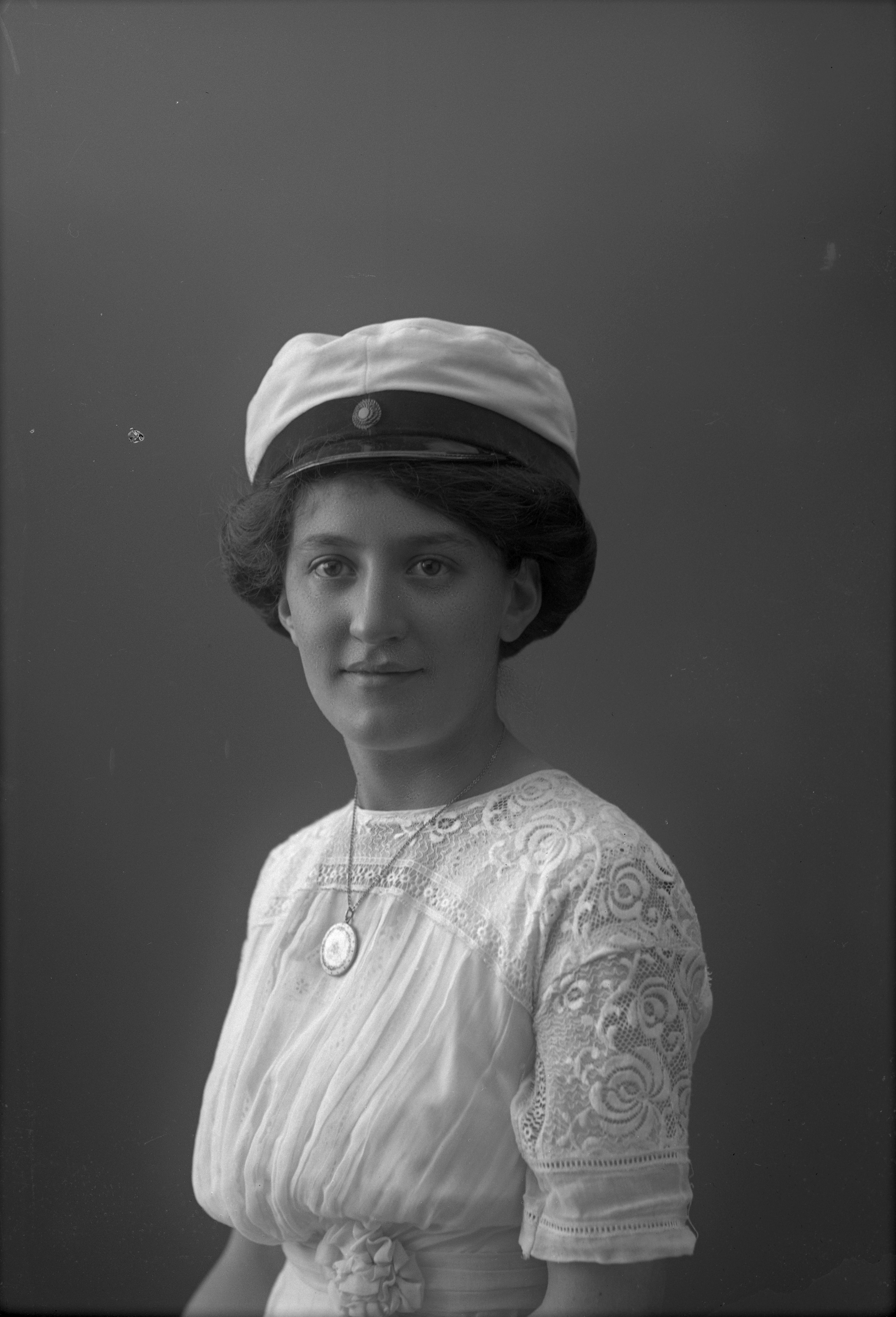 Porträtt i halvfigur av Elna Löfström i studentmössa.