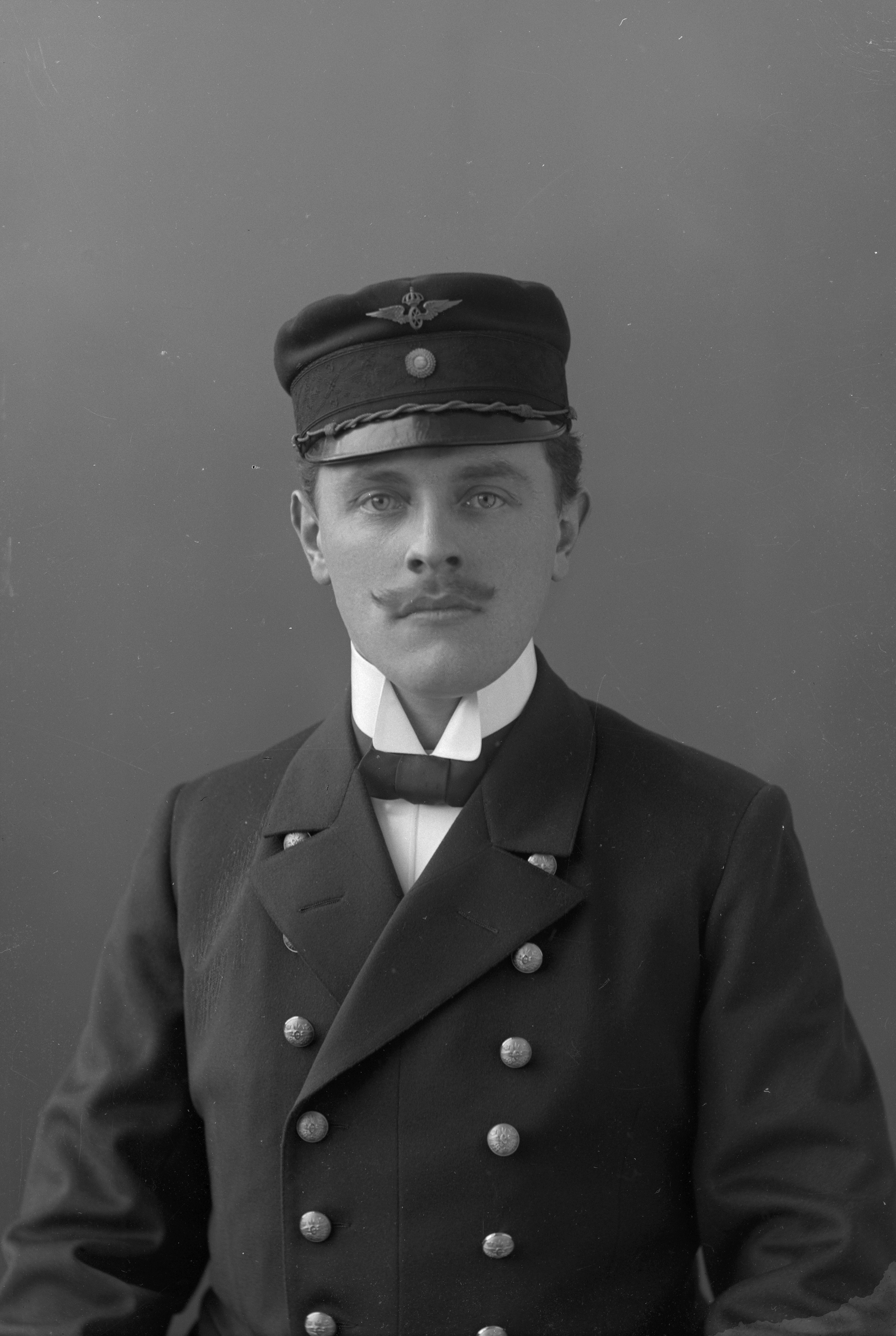 Porträtt i halvfigur av Helge Lagerkvist, iklädd SJ-uniform och mössa.