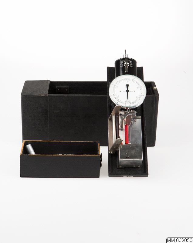 Registrerande varvräknare i svart låda med diverse tillbehör. Användes för mätning av varvtal eller hastighet hos olika maskiner. Tavlan graderad 3-12 och 10-40.