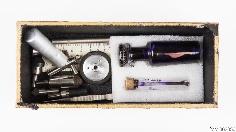 Bland tillbehören finns en pincett, en bläckflaska av glas innehållande blått eller violett bläck, en "linjal", en aluminiumdosa innehållande en liten oljebehållare, en nyckel, en pensel samt några olika trissor som kan kopplas till varvräknaren.