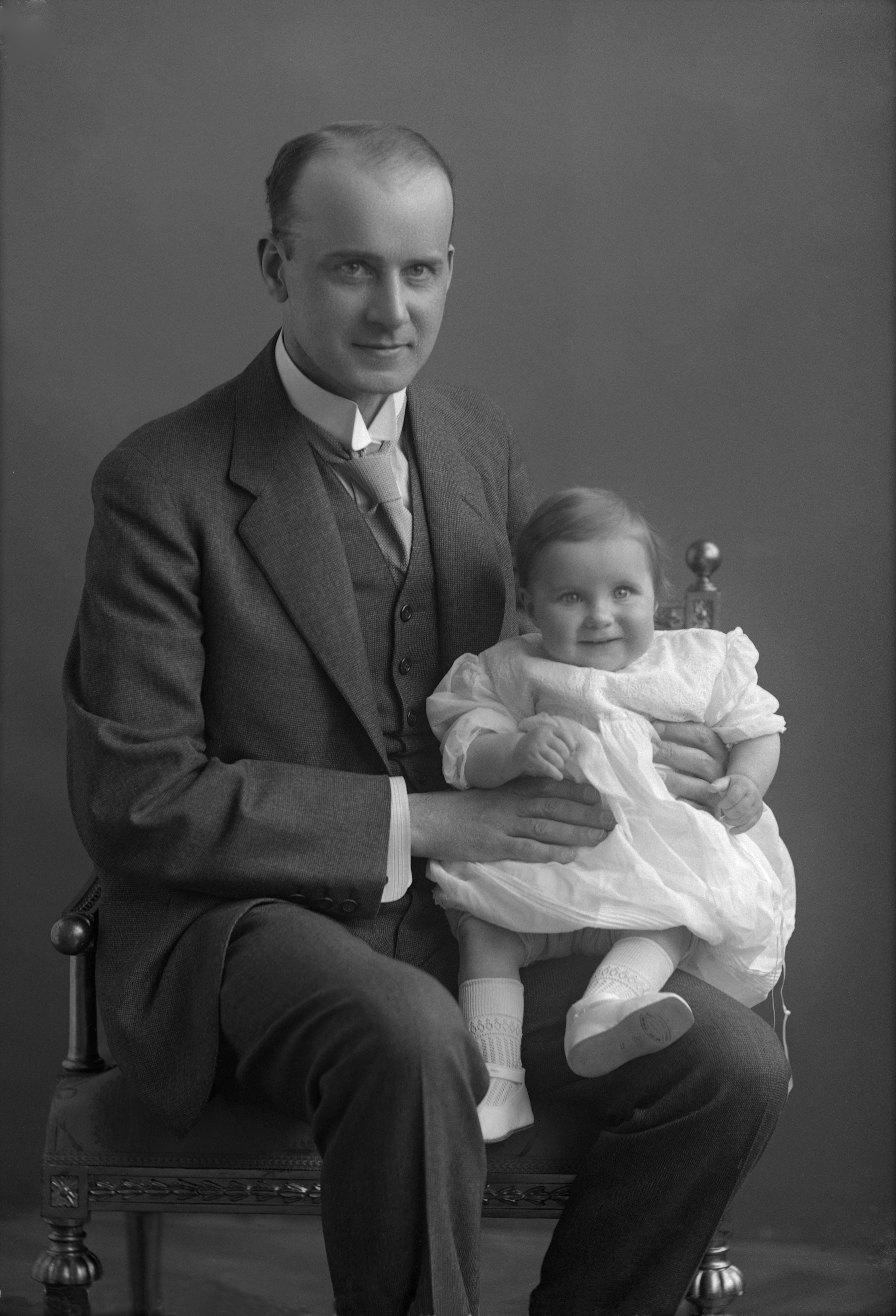 Porträtt i helfigur av järnvägsläkare Per Bergman, sittande i stol med dottern Anna-Stina i knät.