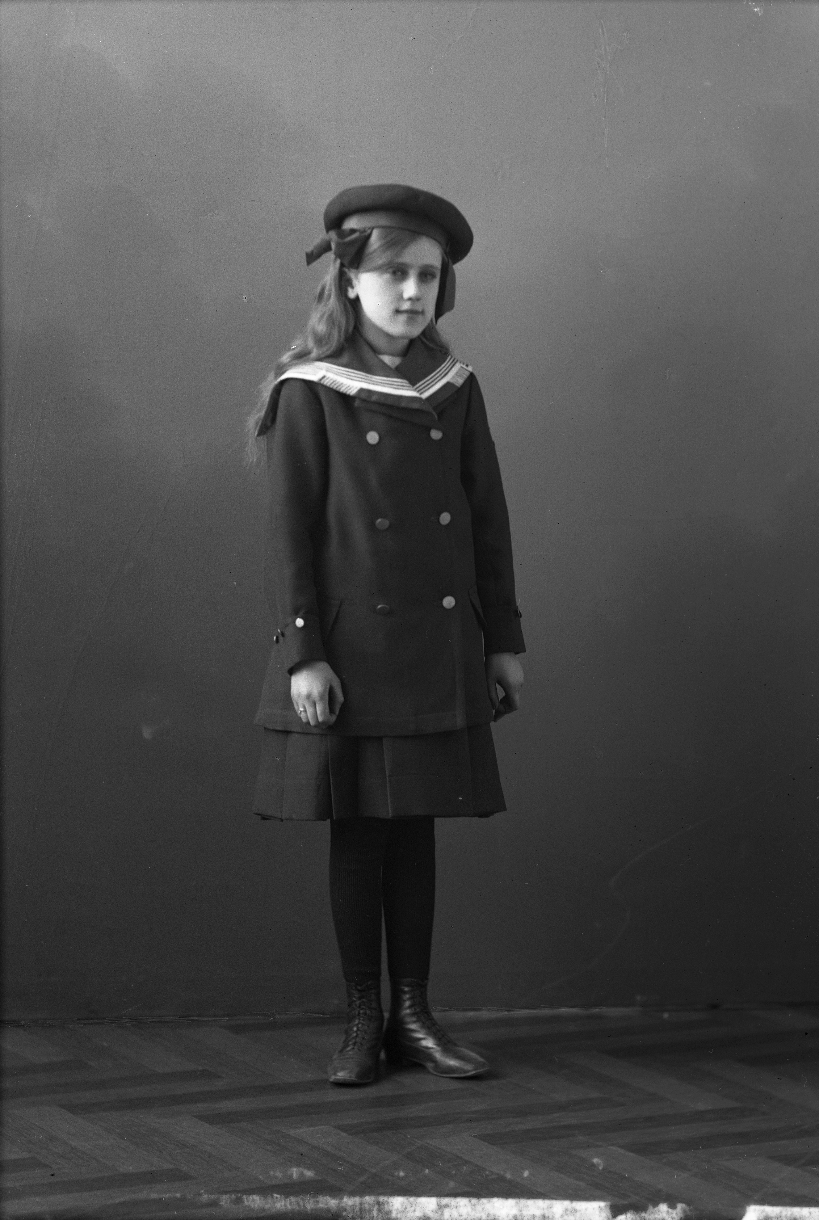 Porträtt i helfigur av Elsa Gellberg, iklädd sjömanskostym.
