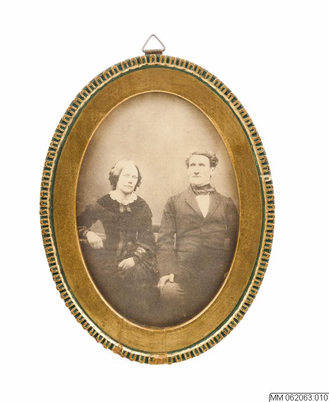 - Fotografi av konstnären Gustaf Rydbergs föräldrar Elise Charlotte och Gustaf Isak. Fotot är ett dubbelporträtt och vi ser paret sittande intill varandra på en bänk i fotoateljén. Elise har sin ena arm vilande på ett bord t.v. och sin andra hand vilande mot benet och lutar sitt huvud lätt åt sidan. Hon är klädd i en mörk dräkt med vit spets i halslinningen där också ett litet runt fotografi i ram sitter som ett smycke. Gustaf Isak sitter med en uppsträckt stel hållning med händerna på vardera knän, klädd i en halvlång knäppt rock och vit skjorta med knuten kravatt. Han har en något vild blick och ringar i båda öronen.