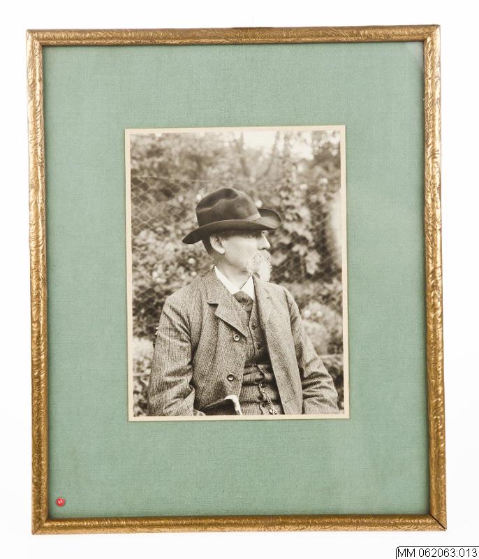 Fotografi av Alfred B. Nilson som avbildar konstnären Gustaf Rydberg på besök i Skanör 1910. Vi ser Rydberg sittande på en stol utanför en nätstaketinhägnad trädgård. Han är avbildad snett framifrån i midjehöjd och har ansiktet vänt i profil åt höger. Han är klädd i rutigt linjemönstrad kavaj med väst. Han bär hatt och håller en promenadkäpp intill sig.