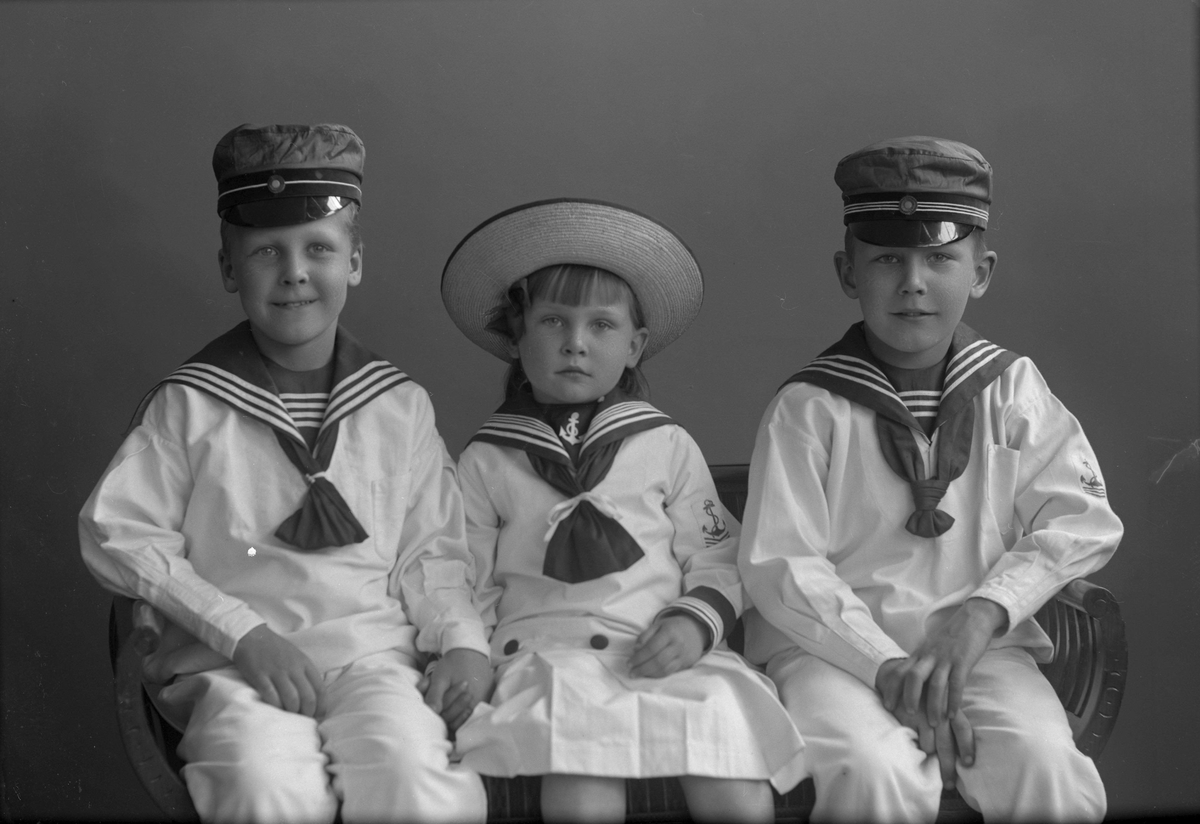 Porträtt i helfigur av Emil, Herbert och Ruth Wagner, sittande tillsammans på bänk. Alla klädda i sjömanskostym och mössor.