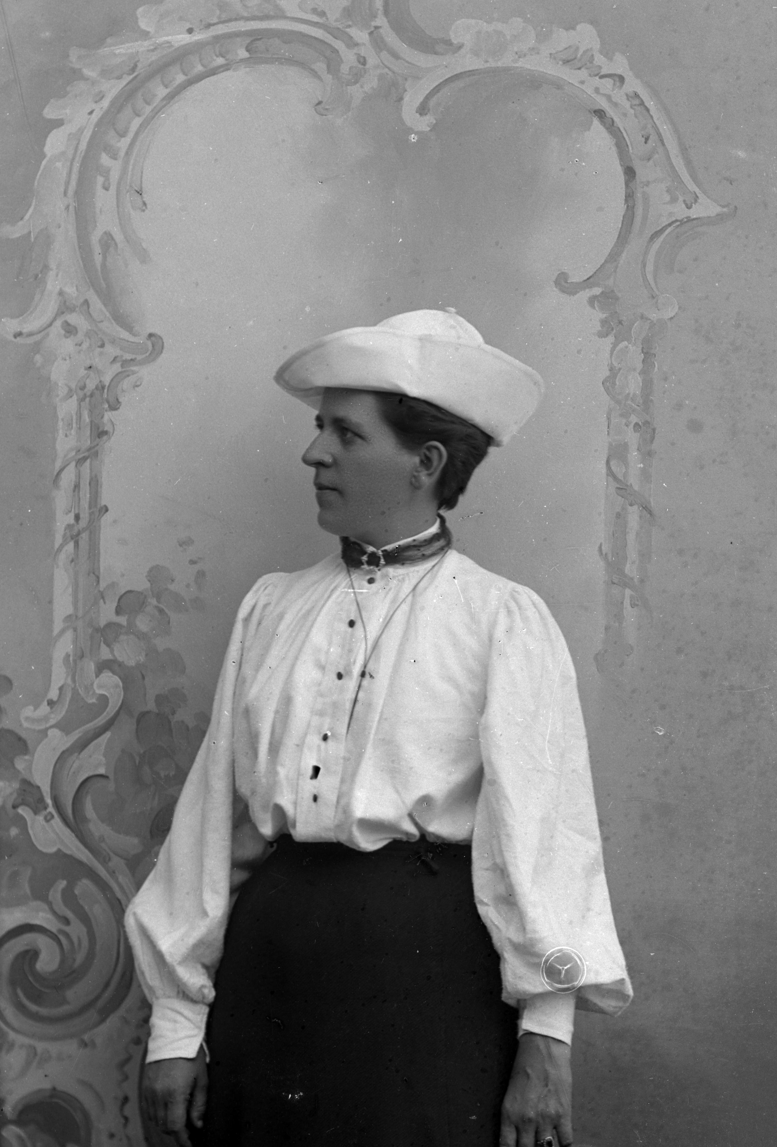 Porträtt i helfigur av konstnärinnan Victoria Westberg, iklädd hatt. Ansikte i profil.