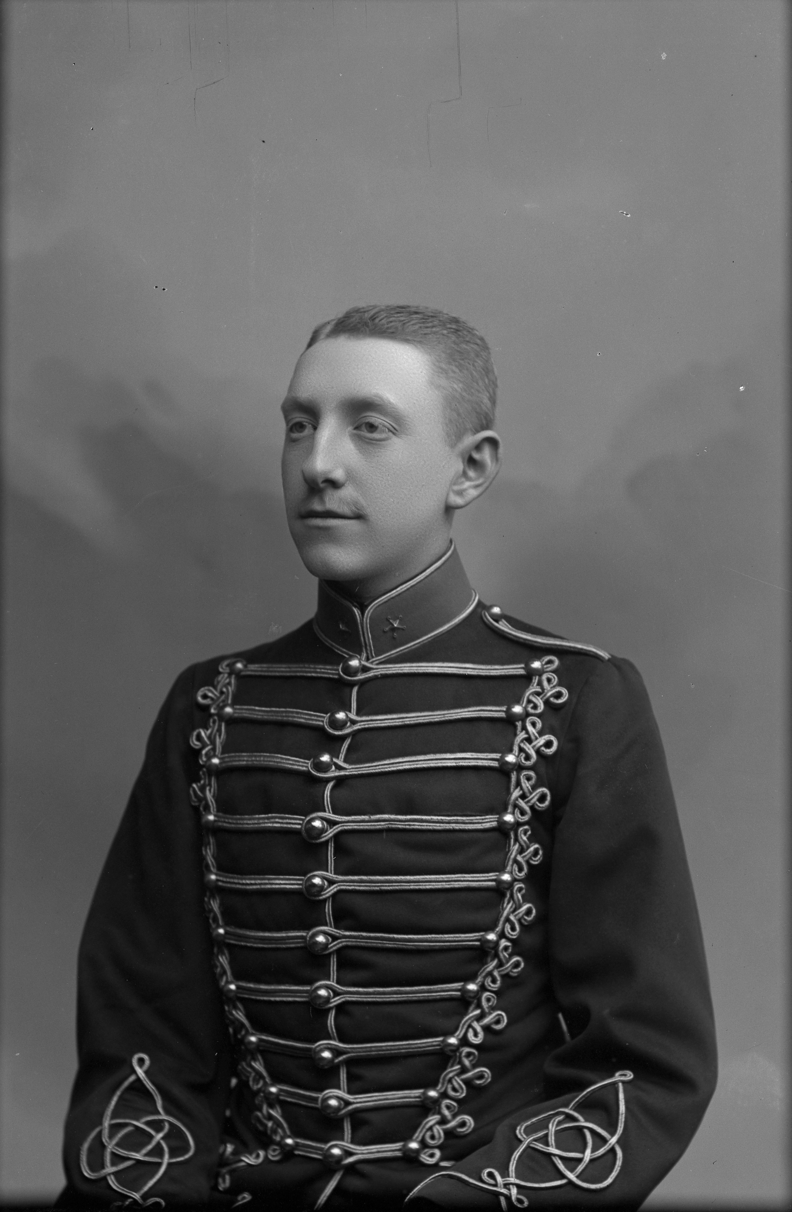 Porträtt i halvfigur av soldat Palmson, iklädd militäruniform.