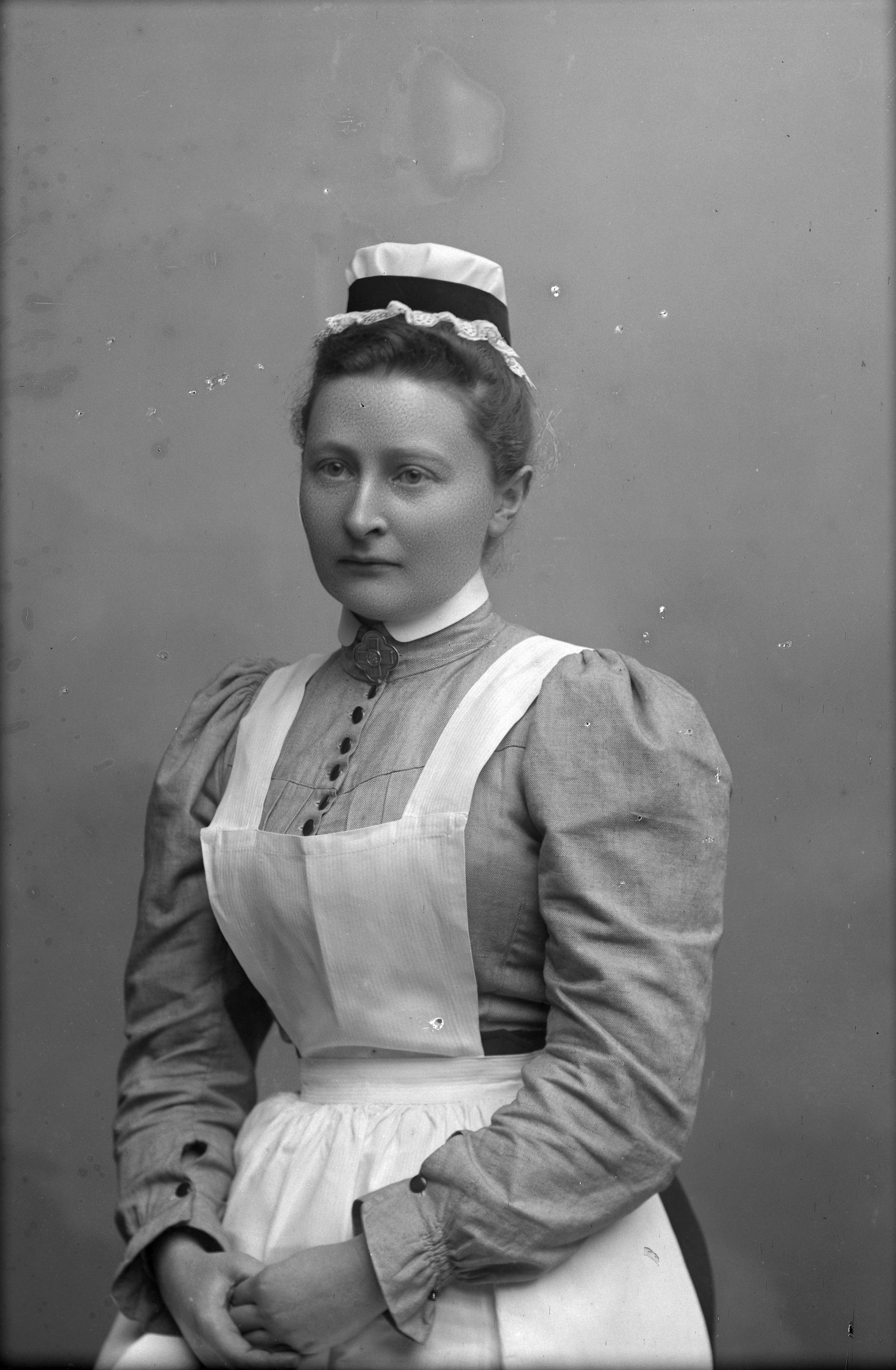 Porträtt i halvfigur av Eva Streijffert, iklädd sjuksköterskeuniform.