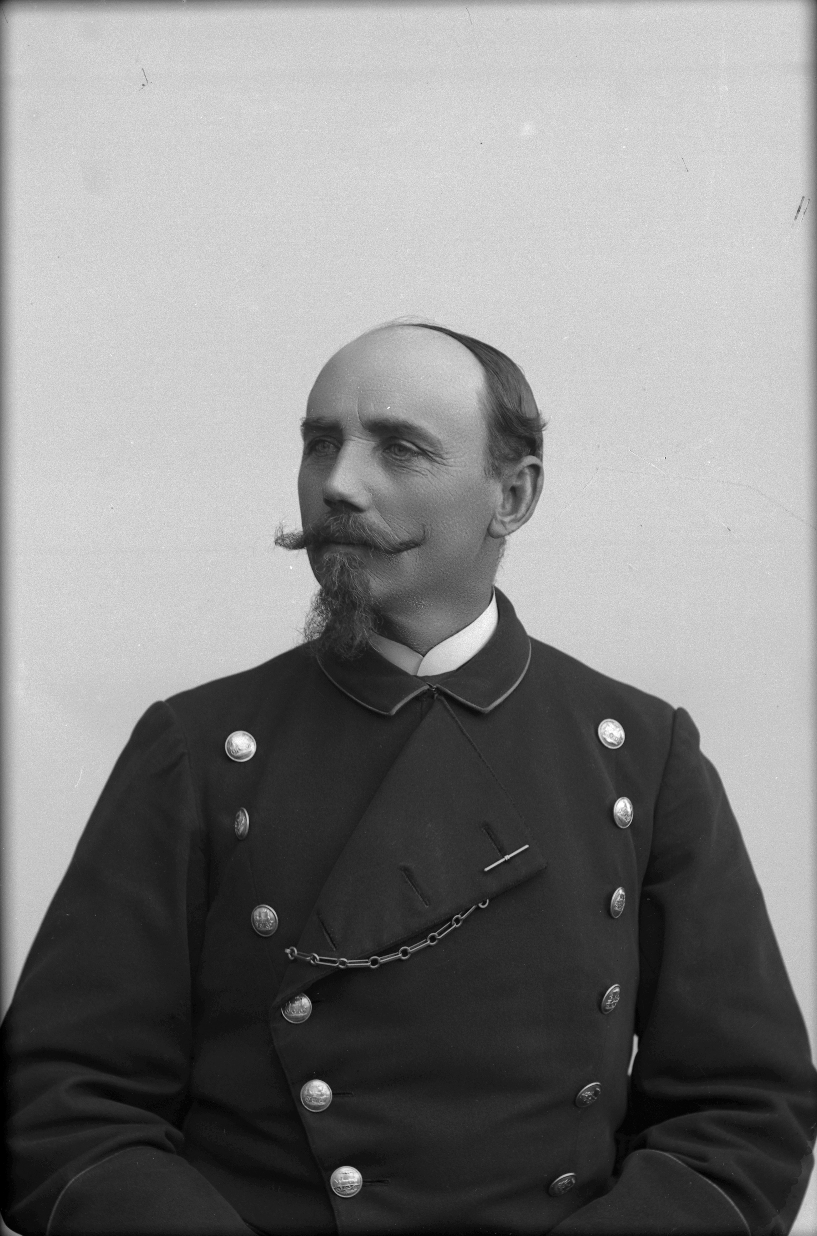 Porträtt i halvfigur av herr Dahlgren, iklädd yrkesuniform, möjligen militäruniform.