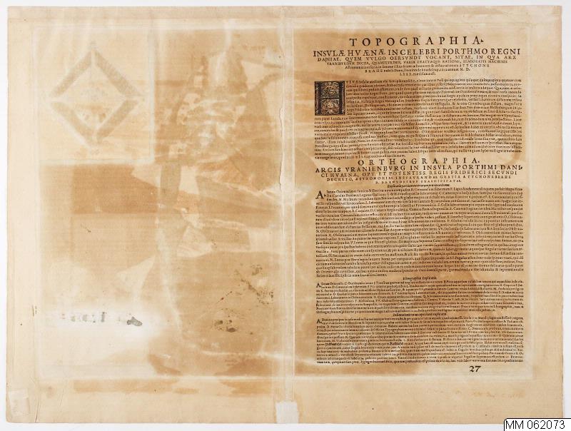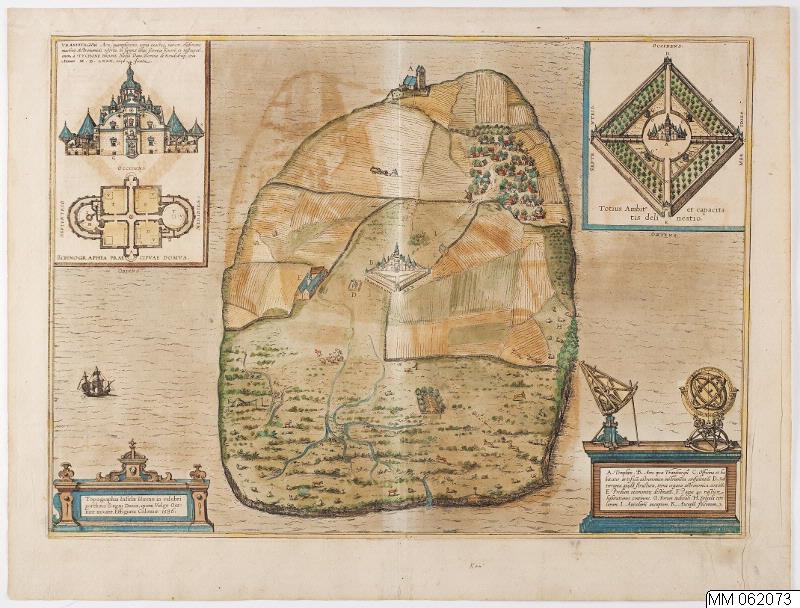 Handkolorerad karta över Ven med Uraniborg i centrum. I övre vänstra hörnet fasadbild och plan över Uraniborg. I övre högra hörnet bild i fågelperspektiv av Uraniborg. Nedre högra hörnet teckenförklaring på röd stentavla på vars översida är placerade 2 mätinstrument för astronomi.