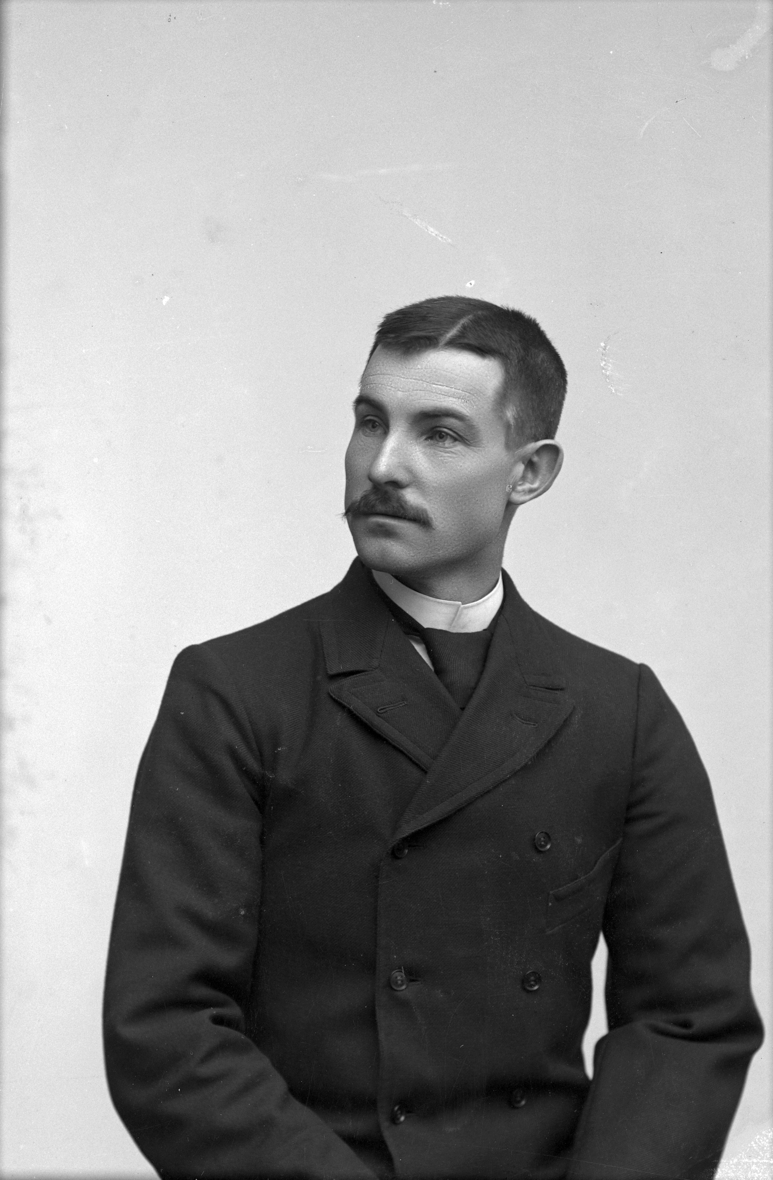 Porträtt i halvfigur av stationskarl G. Sjöborg.