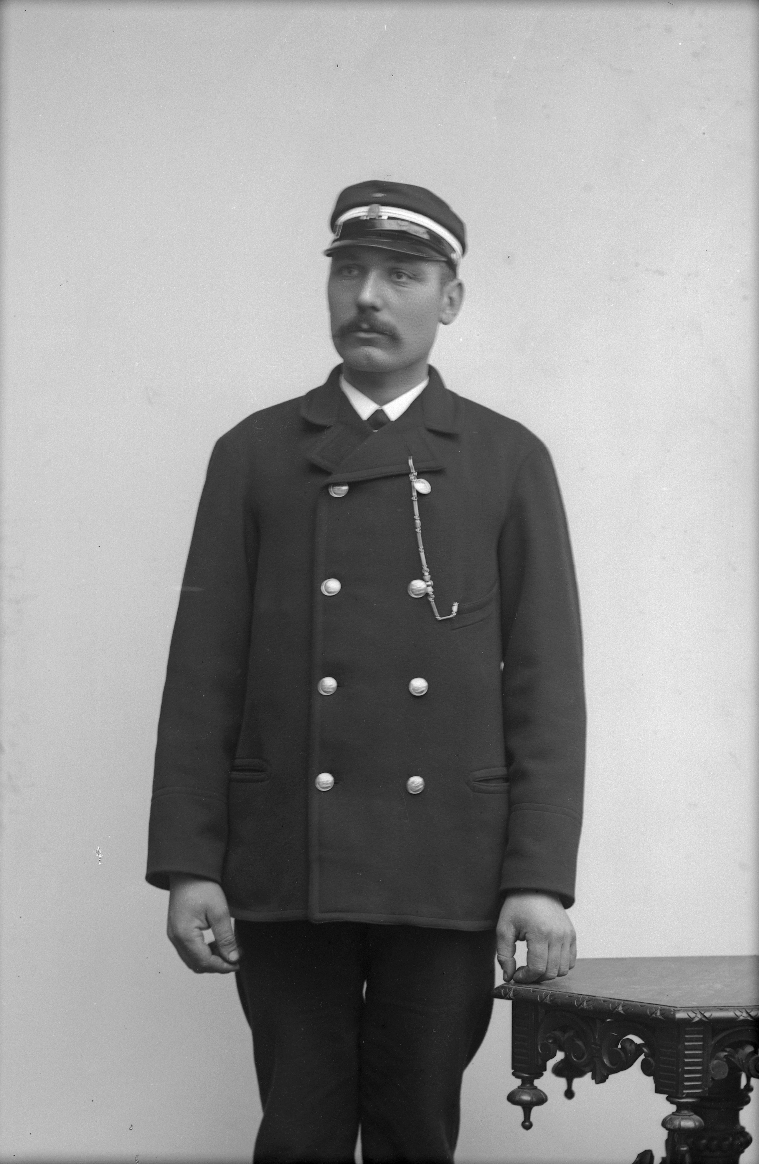 Porträtt i helfigur av stationsförman Olof Svensson Rix, iklädd SJ-uniform och skärmmössa med emblem, stående vid bord.