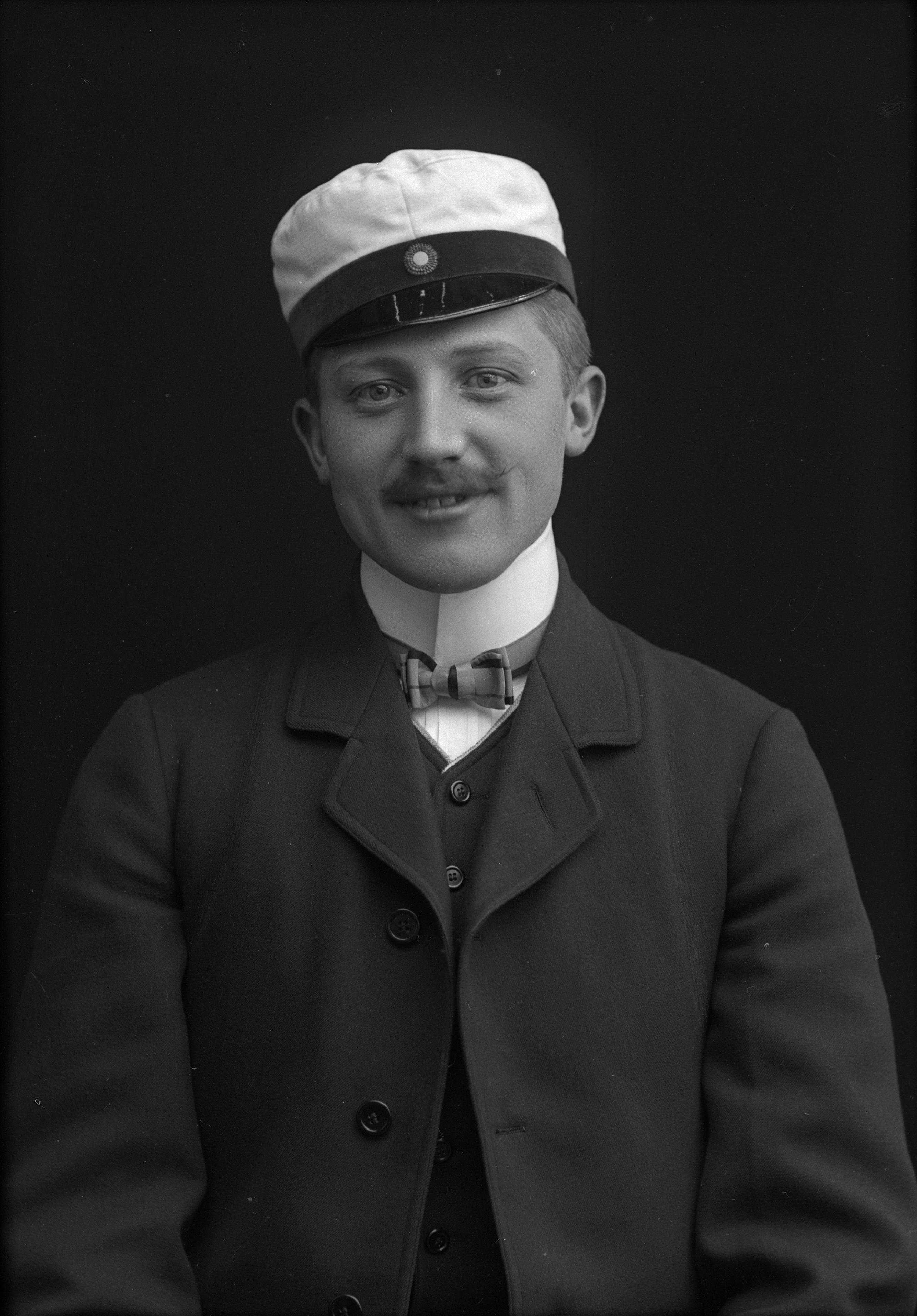 Porträtt i halvfigur av kammarskrivare Oskar Elmqvist i studentmössa.