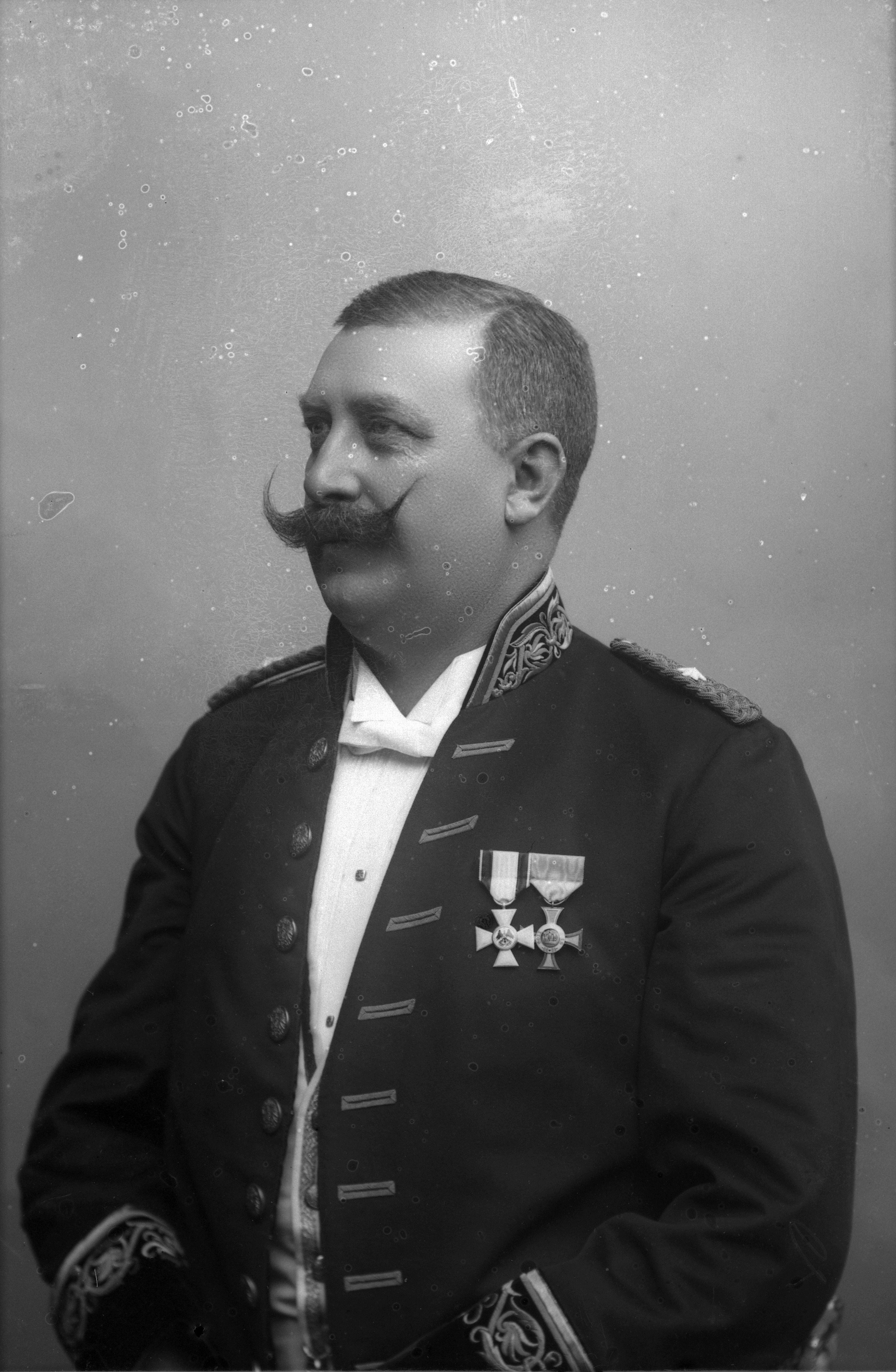 Porträtt i halvfigur av konsuln och handelsmannen Johan Hallbäck, iklädd jacka med broderad krage, broderade knapphål och ärmar och medaljer på bröstet.