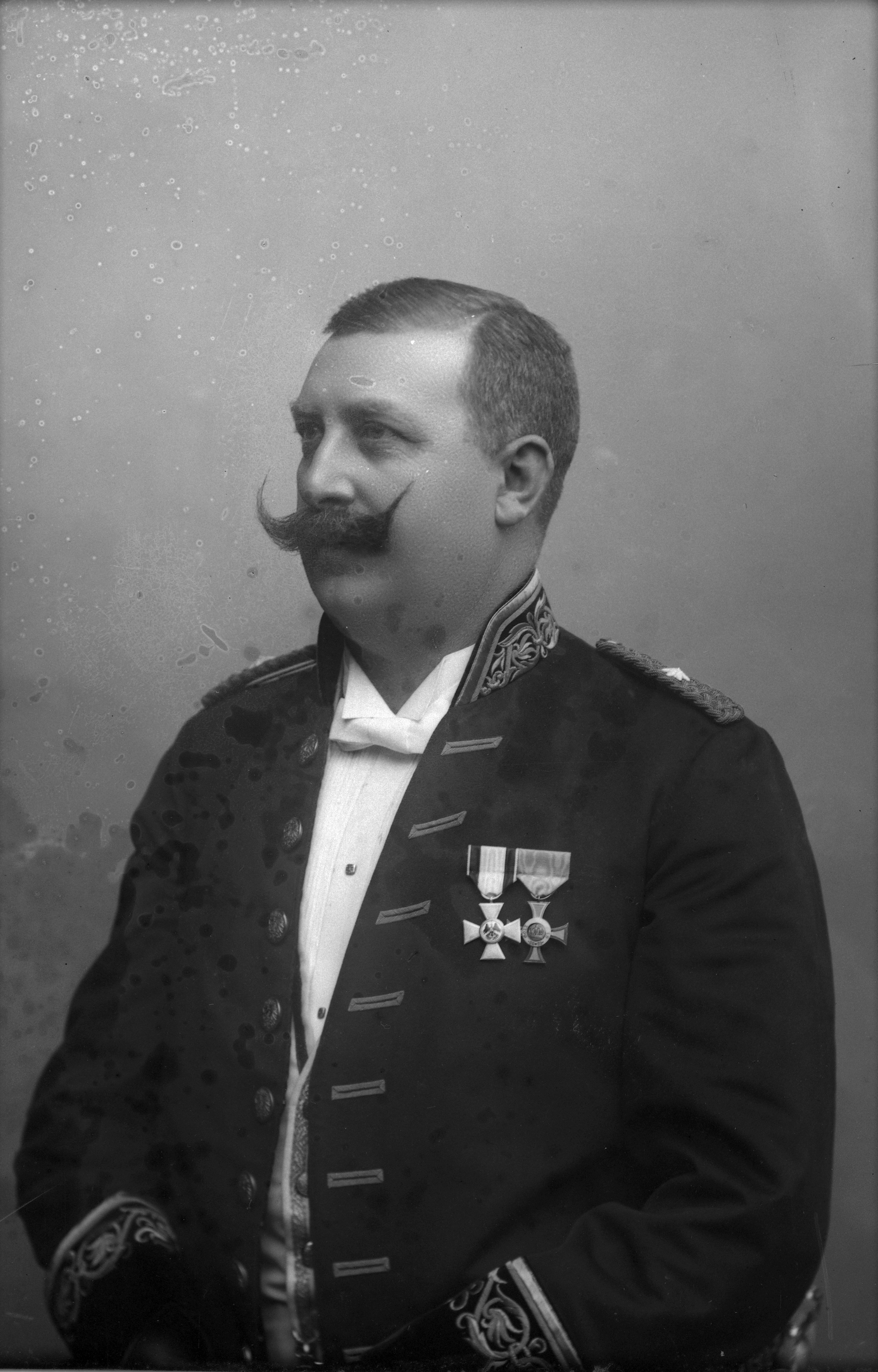 Porträtt i halvfigur av konsuln och handelsmannen Johan Hallbäck, iklädd jacka med broderad krage, broderade knapphål och ärmar och medaljer på bröstet.