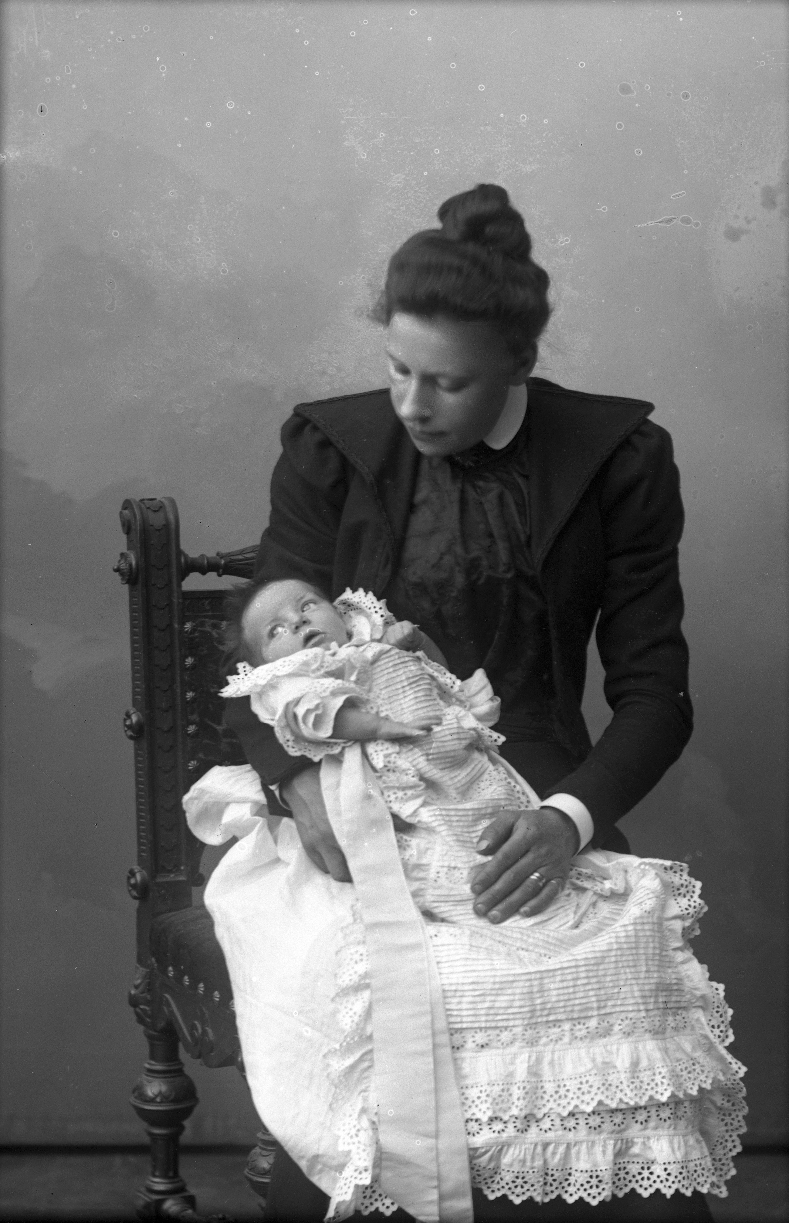 Porträtt i helfigur av Nelly Olsson, sittande med sitt barn, iklätt dopklänning, i knät.