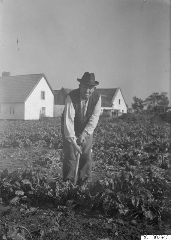Utomhusbild som visar en man som arbetar på fältet med att hacka betor.