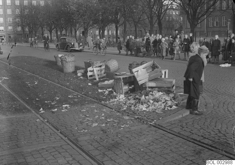 - Utomhusbild som visar resterna efter en kollision mellan spårvagn och lastbil - grönsaker och korgar på gatan, åskådare tittar på. Till höger i bild Rörsjöskolan.
