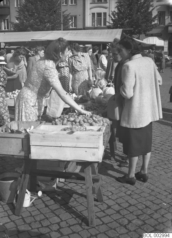 - Utomhusbild som visar en kvinna med kunder i ett marknadsstånd. Torghandel på Möllevångstorget 1949.