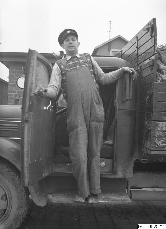 Utomhusbild som visar en man som står vid en lastbil och vagn med betor på flaket. Bilden är tagen under "Betkampanjen" 1949.