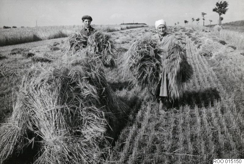 kvinna, kvinnor, pojke, exteriör, åker, 1940-tal, skördearbete, kärve, självbindare, pojkar, 1942