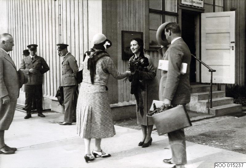 - Prinsessan Ingrid flyger till Amsterdam. Grevinnan Wachtmeister överlämnar en bukett blommor till prinsessan Ingrid, t.v. greve Wachtmeister, t.h. greve Gustaf de la Gardie. Hangar nr 2 i bakgrunden.